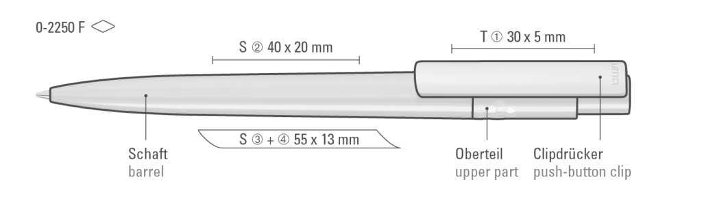 Druckbereich: Auf dem Clip 30mm x 8mm Tampondruck (T), in Clipverlängerung 40mm x 20mm Siebdruck (S), gegenüber vom Clip 55mm x 13mm Siebdruck (S), seitlich vom Clip 55mm x 13mm Siebdruck (S)