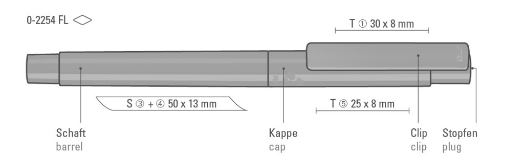 Druckbereich: Auf dem Clip 30mm x 8mm Tampondruck (T), gegenüber vom Clip 50mm x 13mm Siebdruck (S), seitlich vom Clip 50mm x 13mm Siebdruck (S), auf der Kappe/auf dem Oberteil 25mm x 8mm Tampondruck (T)
