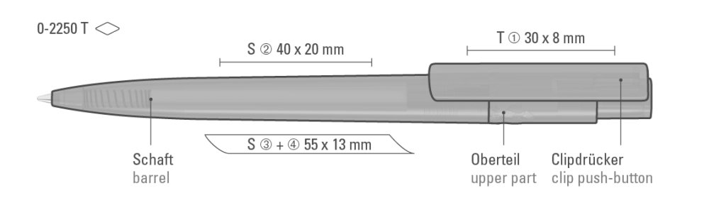 Druckbereich: In Clipverlängerung 40mm x 20mm Siebdruck (S), gegenüber vom Clip 55mm x 13mm Siebdruck (S), auf dem Clip 30mm x 8mm Tampondruck (T), seitlich vom Clip 55mm x 13mm Siebdruck (S)