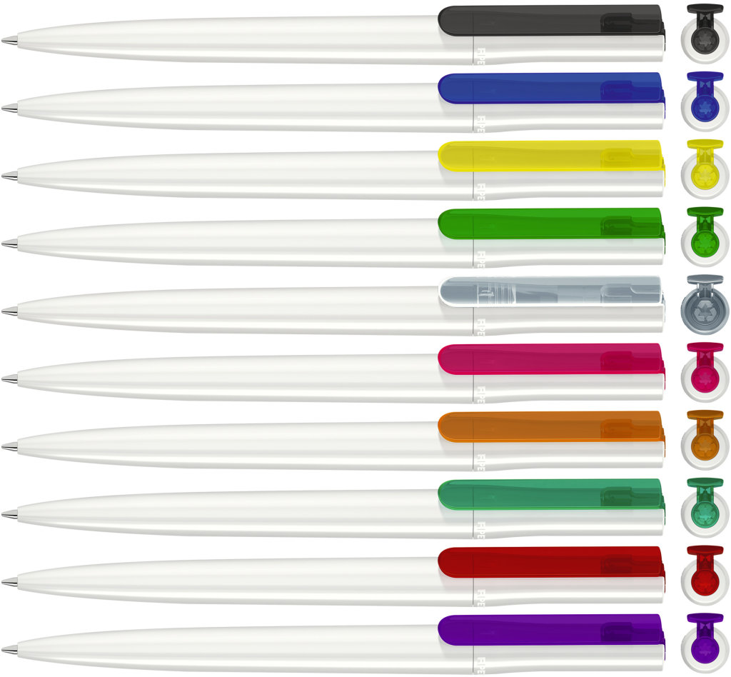 Weißer Kunststoff-Kugelschreiber mit farbigem Clip, blauschreibend.Maße: ø10×138 mmSchreibgerät-Typ: KugelschreiberSchreibgerät-Mechanik: DruckmechanikSchreibfarbe: BlauMinentyp: Normale MineLinienstärke: 1 mmMaterial: Kunststoff (ABS)Veredelungsposition 1: Korpus - rechts vom ClipTechnologie: UV-LED-Druck - EinzelnamenDurchmesser: 0Druckcode: NUVATechnologie: TampondruckMaximale Farben: 4Durchmesser: 0Druckcode: P0Technologie: TampondruckMaximale Farben: 1Durchmesser: 0Druckcode: P1Technologie: UV LED DruckDurchmesser: 0Druckcode: UVAVeredelungsposition 2: Korpus - links vom ClipTechnologie: UV-LED-Druck - EinzelnamenDurchmesser: 0Druckcode: NUVATechnologie: TampondruckMaximale Farben: 4Durchmesser: 0Druckcode: P0Technologie: TampondruckMaximale Farben: 1Durchmesser: 0Druckcode: P1Technologie: UV LED DruckDurchmesser: 0Druckcode: UVAVeredelungsposition 3: KlipTechnologie: TampondruckMaximale Farben: 4Durchmesser: 0Druckcode: P0Veredelungsposition 4: Korpus - in Verlängerung vom ClipTechnologie: TampondruckMaximale Farben: 4Durchmesser: 0Druckcode: P0