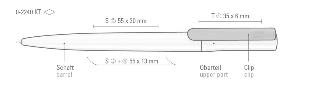 Druckbereich: In Clipverlängerung 55mm x 20mm Siebdruck (S), gegenüber vom Clip 55mm x 13mm Siebdruck (S), auf dem Clip 35mm x 6mm Tampondruck (T), seitlich vom Clip 55mm x 13mm Siebdruck (S)