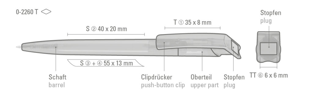 Druckbereich: In Clipverlängerung 40mm x 20mm Siebdruck (S), seitlich vom Clip 55mm x 13mm Siebdruck (S), gegenüber vom Clip 55mm x 13mm Siebdruck (S), auf dem Clip 35mm x 8mm Tampondruck (T), auf dem Stopfen 6mm x 6mm Tampondruck Sonderformat (TT)