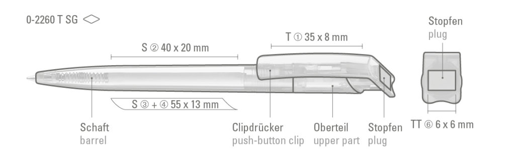 Druckbereich: In Clipverlängerung 40mm x 20mm Siebdruck (S), seitlich vom Clip 55mm x 13mm Siebdruck (S), gegenüber vom Clip 55mm x 13mm Siebdruck (S), auf dem Clip 35mm x 8mm Tampondruck (T), auf dem Stopfen 6mm x 6mm Tampondruck Sonderformat (TT)