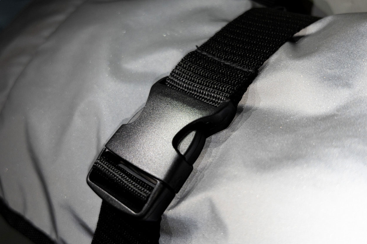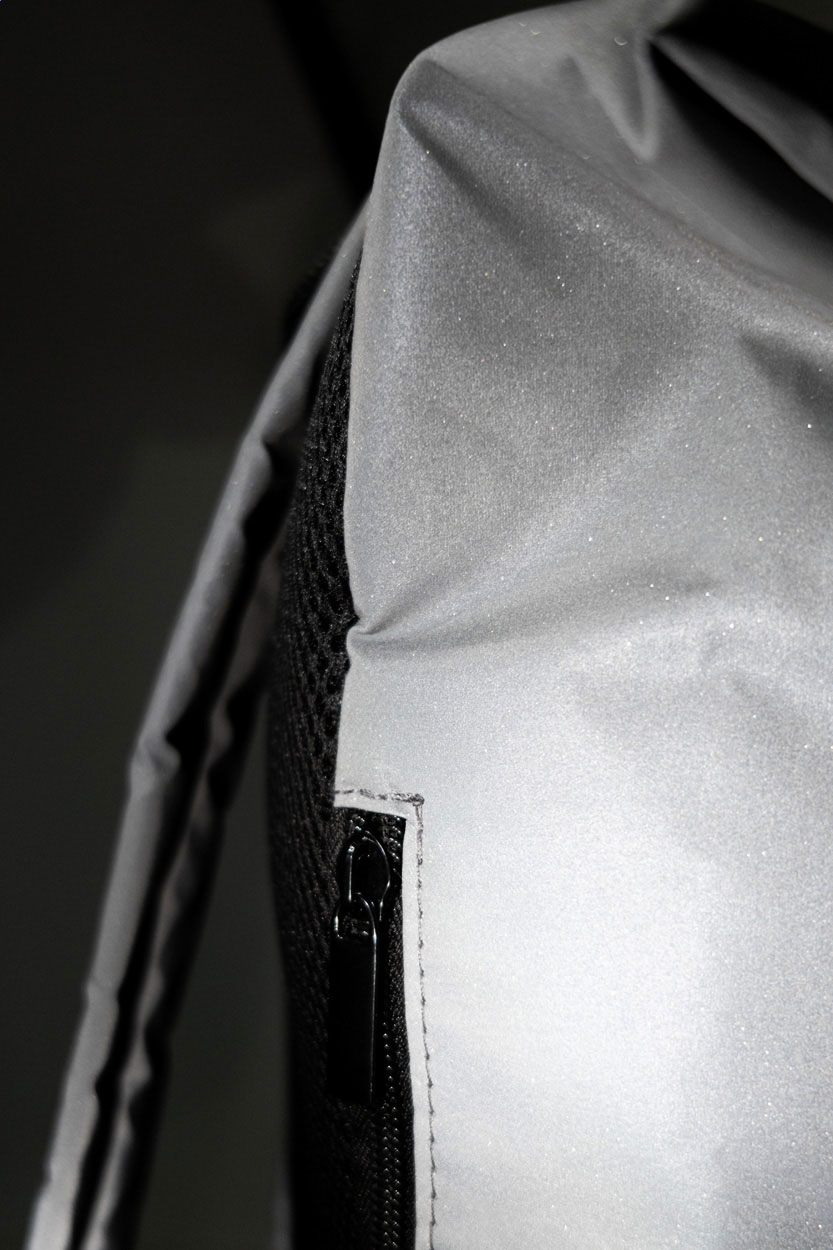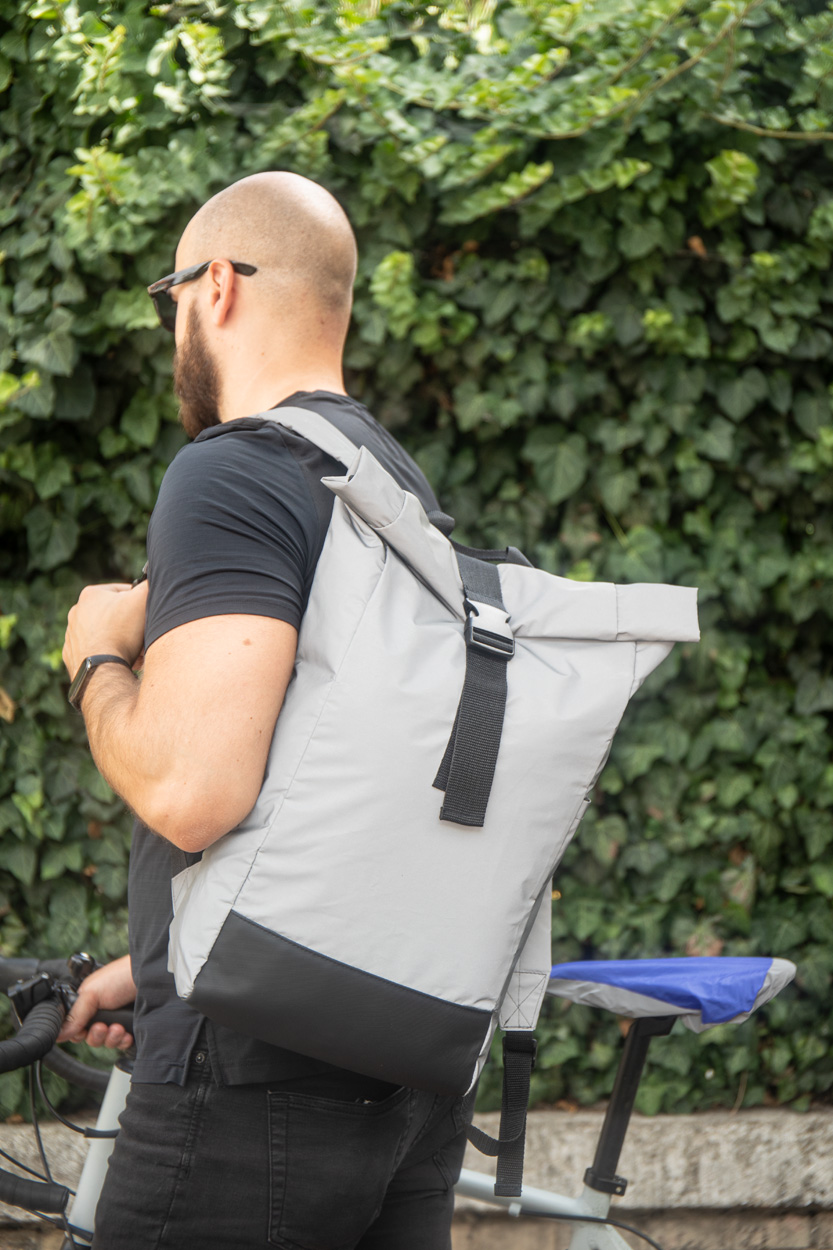 Reflektierender Rolltop-Rucksack aus RPET-Polyester mit Hauptfach mit Schnallenverschluss, versteckter Reißverschlusstasche, gepolstertem Laptopfach (15"), Seitentasche, gepolstertem Rücken und Schultergurten. Mit RPET-Label. Nur für Werbezwecke geeignet, das Produkt erfüllt nicht die Voraussetzungen für persönliche Schutzausrüstung.