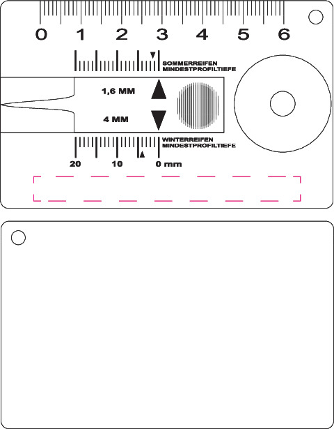Reifenprofilmesser im Scheckkartenformat mit Millimeter-Skala und herausnehmbarem Einkaufswagenchip. Inklusive Loch zum Befestigen am Schlüsselbund.