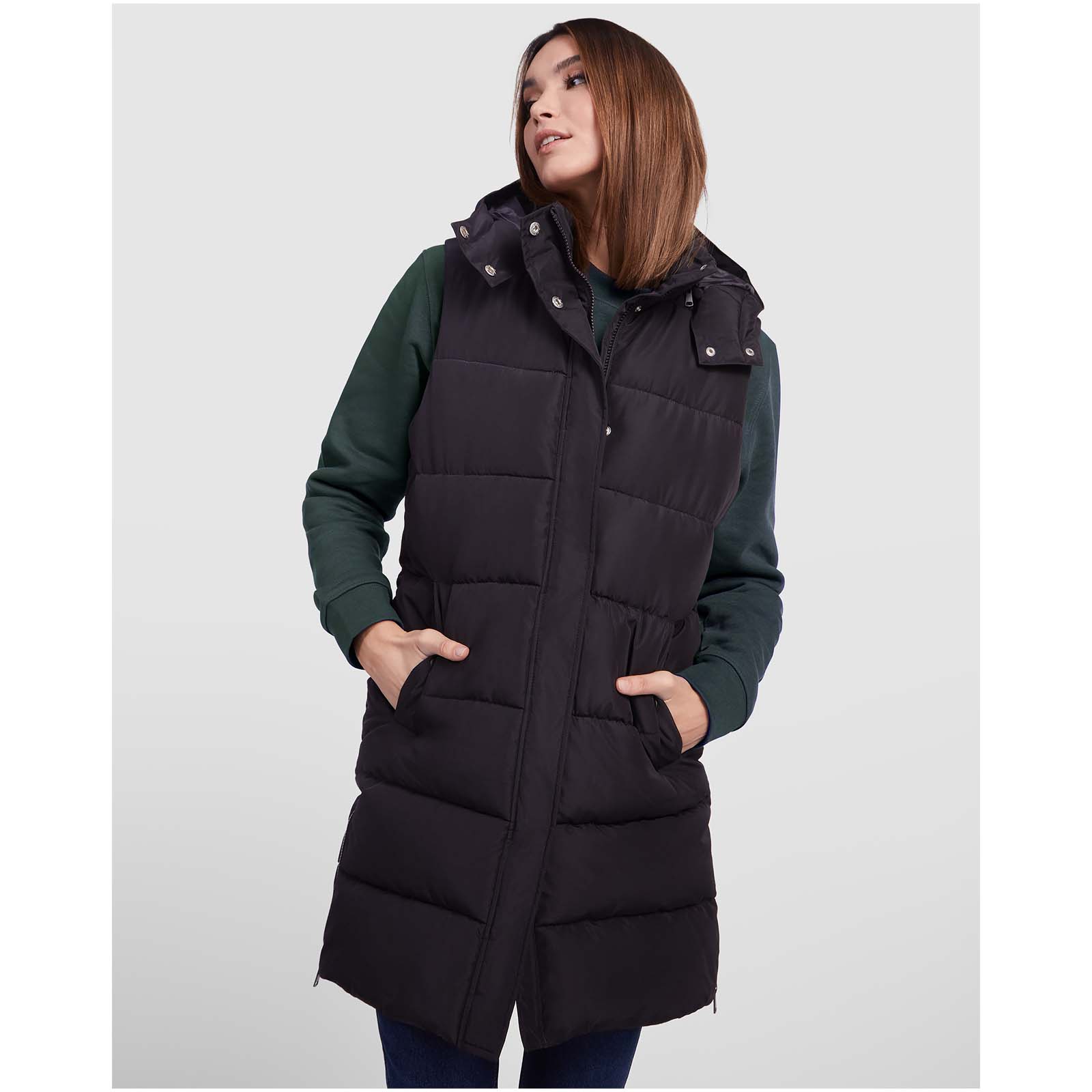 Wattierte Weste mit abnehmbarer Kapuze. Hoher Kragen. Reißverschluss auf der Vorderseite, verdeckt durch eine Patte. Zwei Taschen mit Druckknopfverschluss. Seitliche Öffnungen mit Reißverschlüssen. Zugang zur Brust von der Innenseite. Wasserabweisend.Besonderheiten:- Geschlecht: Weiblich- OEKO-TEX®- SMETAMaterial: Taft 100% Polyester, Lining, 100% Polyester, Padding/filling, 100% PolyesterStandard-Druck---------------Druckart: Stick fixDruckposition: linke BrustDruckgröße: 78 x 78 mm mm (BxH)Druckfarben maximal: 12Zusätzliche Informationen: Schauen Sie bitte vor der Bestellung in die Roly Größentabelle. Roly folgt den spanischen Größen, die eine eher slim-fit Passform haben.Suchwörter: roly, Weste, Thermoweste, Bodywamer