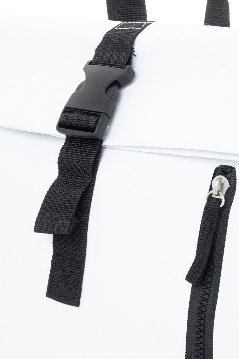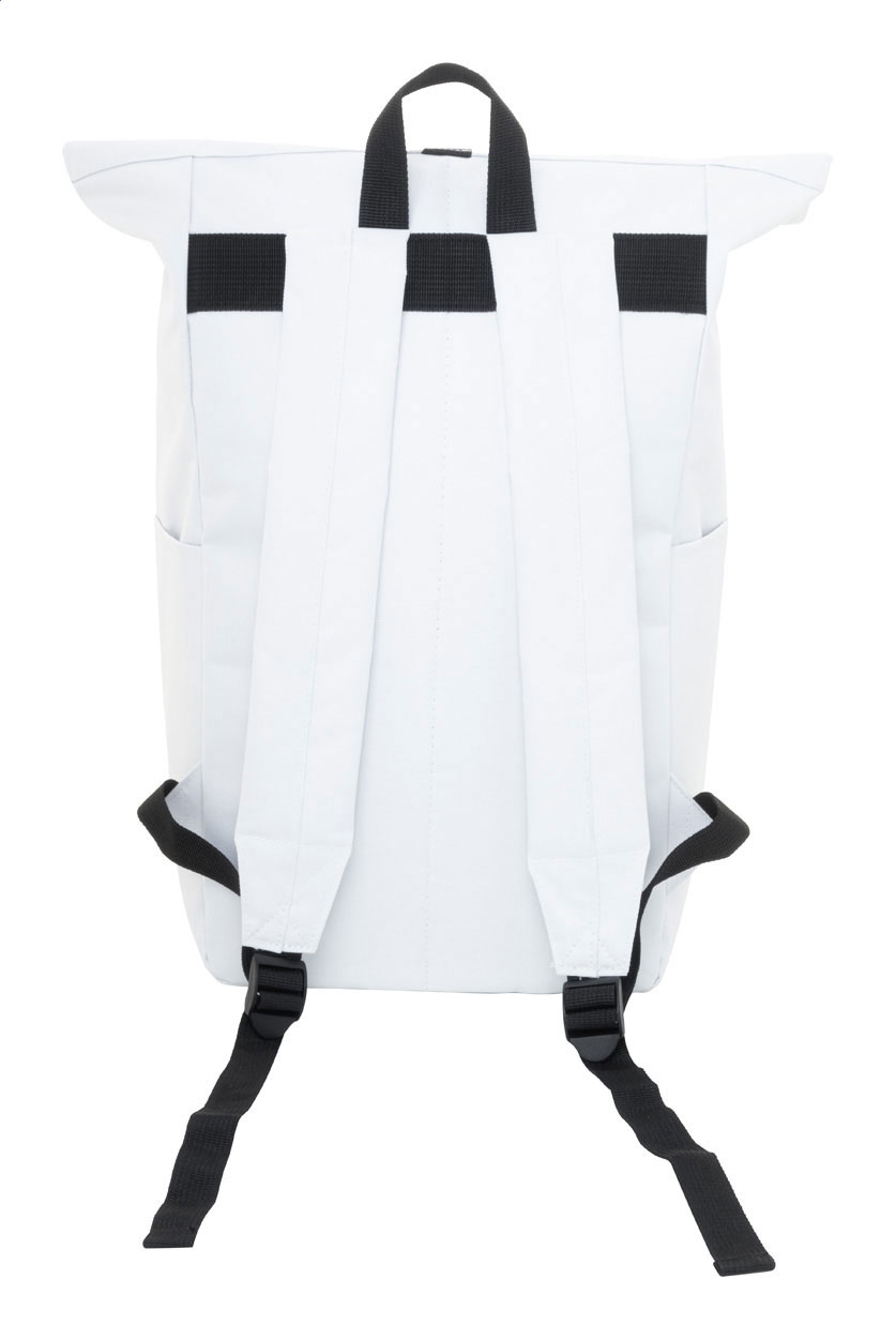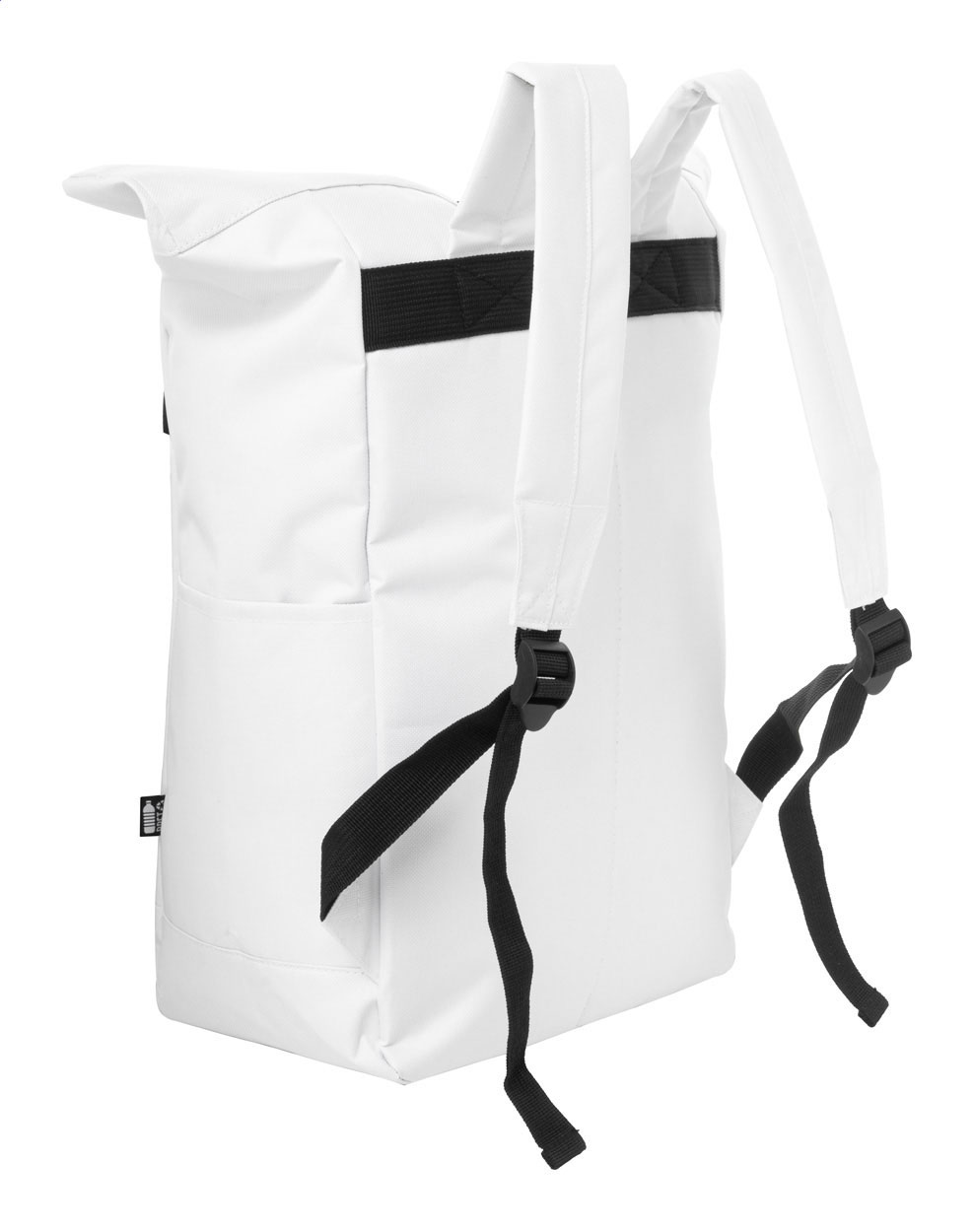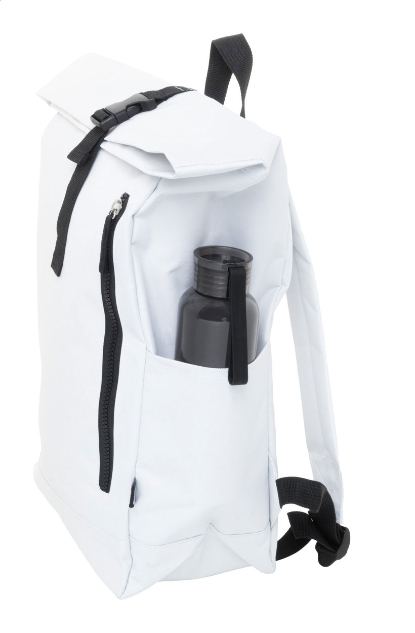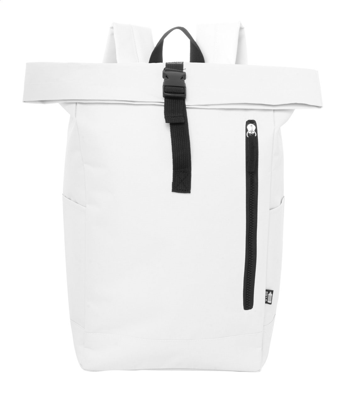 RPET-Rolltop-Rucksack mit Schnallenverschluss, Laptopfach (14") und Reißverschluss-Fronttasche. Mit gepolstertem Rücken und Schultergurten. Material: 600D RPET-Polyester. Mit RPET-Label.