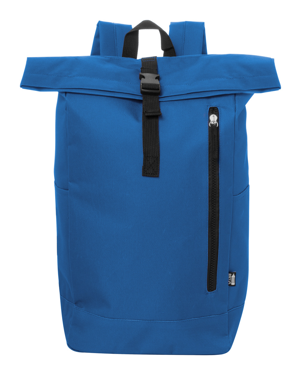 RPET-Rolltop-Rucksack mit Schnallenverschluss, Laptopfach (14") und Reißverschluss-Fronttasche. Mit gepolstertem Rücken und Schultergurten. Material: 600D RPET-Polyester. Mit RPET-Label.