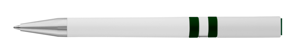 Drehkugelschreiber mit gedeckt glänzendem Gehäuse in weiß, farbig eingelassene Ringe und Stopfen im Oberteil. Metallclip und Spitze in silber glänzend.Druckbereich: In Clipverlängerung 45mm x 20mm Siebdruck (S), gegenüber vom Clip 45mm x 20mm Siebdruck (S), seitlich vom Clip 45mm x 20mm Siebdruck (S), auf der Kappe/auf dem Oberteil 25mm x 7mm Tampondruck (T)