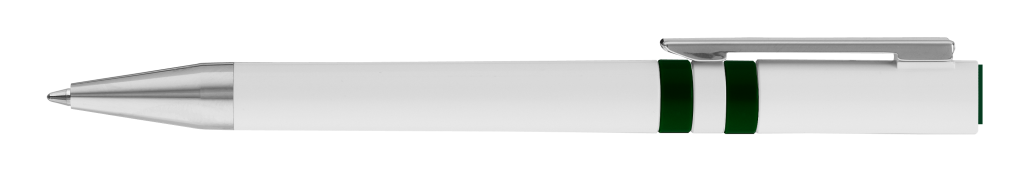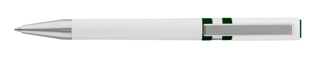 Drehkugelschreiber mit gedeckt glänzendem Gehäuse in weiß, farbig eingelassene Ringe und Stopfen im Oberteil. Metallclip und Spitze in silber glänzend.