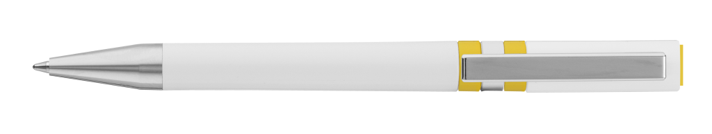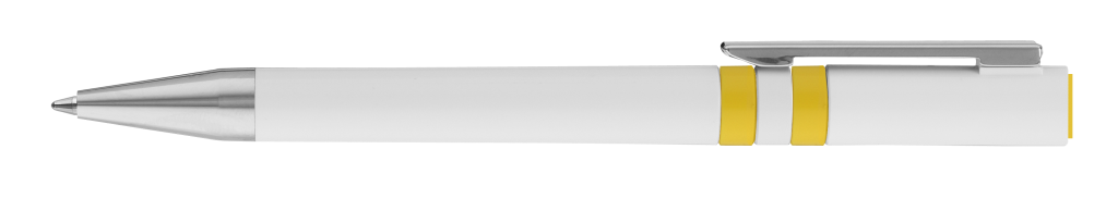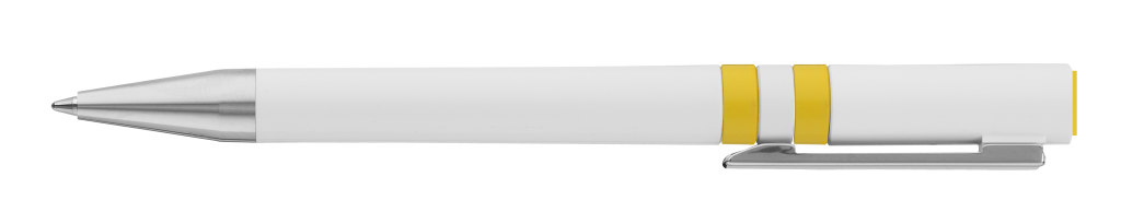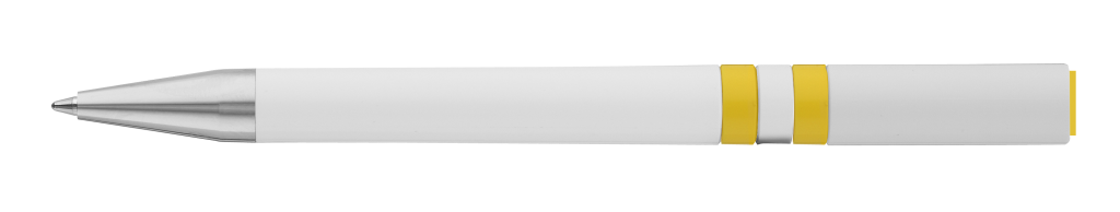 Drehkugelschreiber mit gedeckt glänzendem Gehäuse in weiß, farbig eingelassene Ringe und Stopfen im Oberteil. Metallclip und Spitze in silber glänzend.