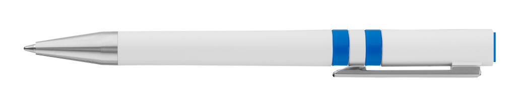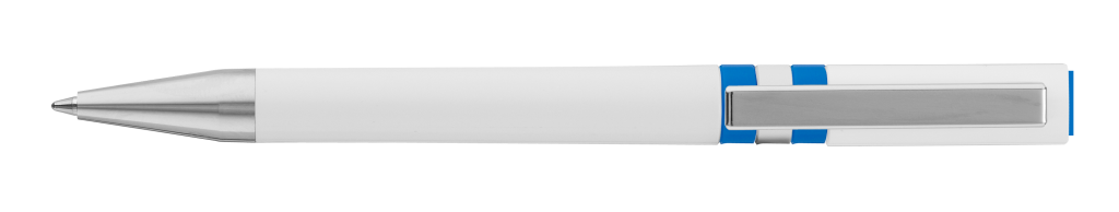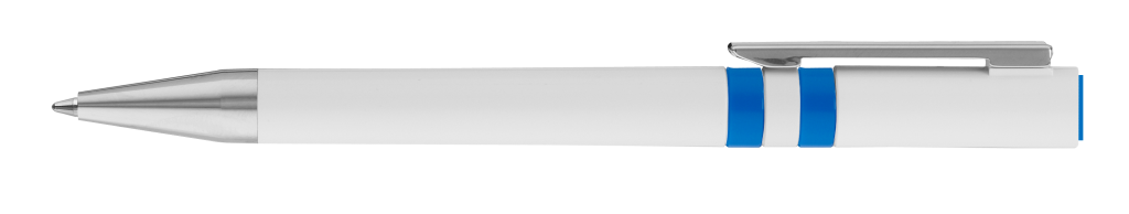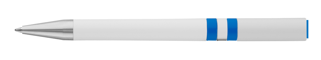 Drehkugelschreiber mit gedeckt glänzendem Gehäuse in weiß, farbig eingelassene Ringe und Stopfen im Oberteil. Metallclip und Spitze in silber glänzend.
