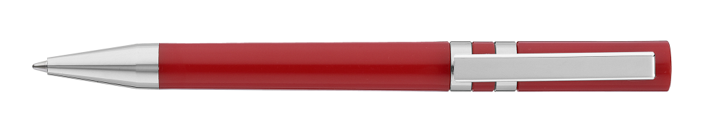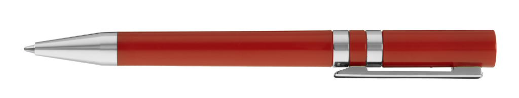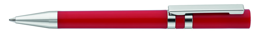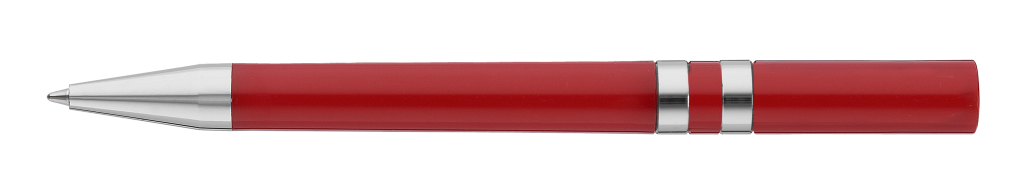 Drehkugelschreiber mit gedeckt glänzendem Gehäuse. Eingelassene Ringe, Stopfen im Oberteil, Metallclip und Spitze in silber glänzend.