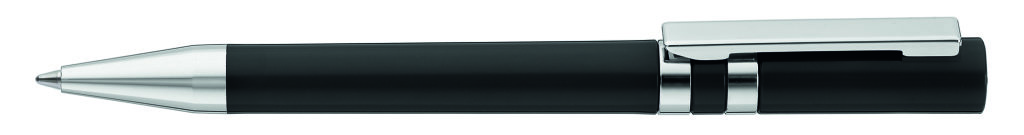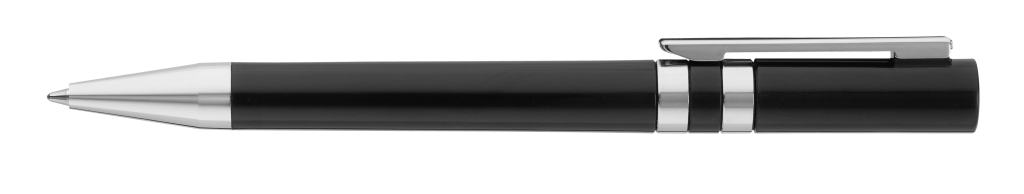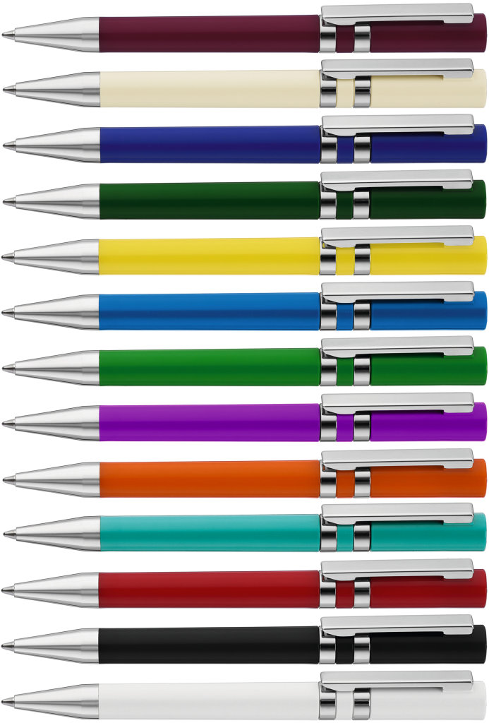 Drehkugelschreiber mit gedeckt glänzendem Gehäuse. Eingelassene Ringe, Stopfen im Oberteil, Metallclip und Spitze in silber glänzend.Druckbereich: In Clipverlängerung 45mm x 20mm Siebdruck (S), gegenüber vom Clip 45mm x 20mm Siebdruck (S), seitlich vom Clip 45mm x 20mm Siebdruck (S), auf der Kappe/auf dem Oberteil 25mm x 7mm Tampondruck (T)