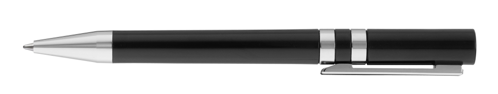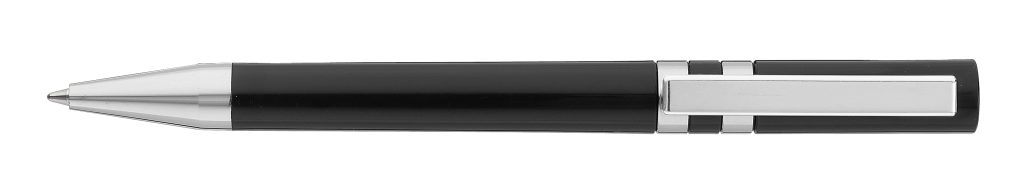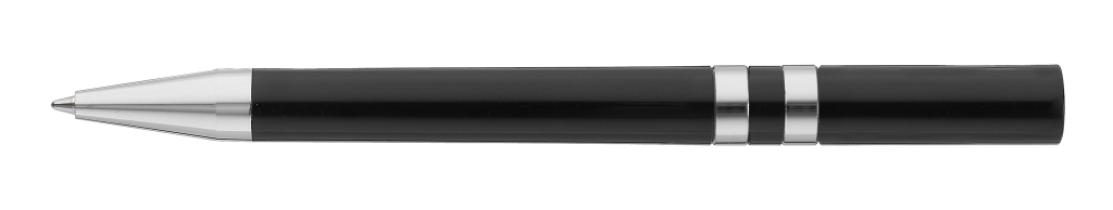 Drehkugelschreiber mit gedeckt glänzendem Gehäuse. Eingelassene Ringe, Stopfen im Oberteil, Metallclip und Spitze in silber glänzend.