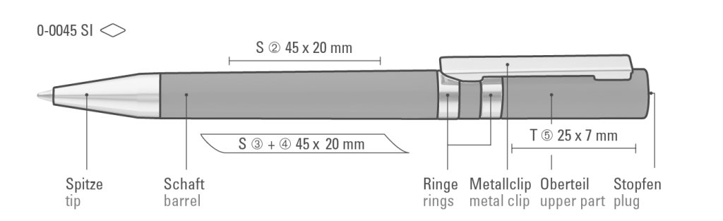 Druckbereich: In Clipverlängerung 45mm x 20mm Siebdruck (S), gegenüber vom Clip 45mm x 20mm Siebdruck (S), seitlich vom Clip 45mm x 20mm Siebdruck (S), auf der Kappe/auf dem Oberteil 25mm x 7mm Tampondruck (T)