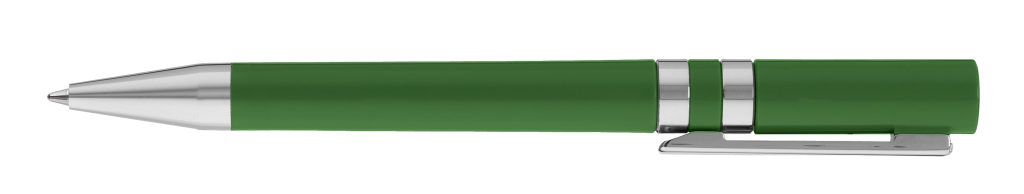 Drehkugelschreiber mit gedeckt glänzendem Gehäuse. Eingelassene Ringe, Stopfen im Oberteil, Metallclip und Spitze in silber glänzend.Druckbereich: In Clipverlängerung 45mm x 20mm Siebdruck (S), gegenüber vom Clip 45mm x 20mm Siebdruck (S), seitlich vom Clip 45mm x 20mm Siebdruck (S), auf der Kappe/auf dem Oberteil 25mm x 7mm Tampondruck (T)