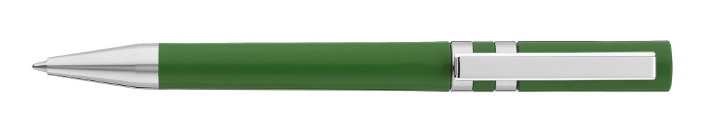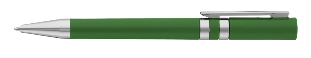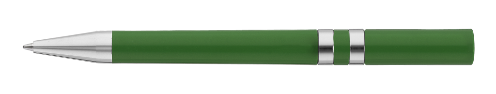 Drehkugelschreiber mit gedeckt glänzendem Gehäuse. Eingelassene Ringe, Stopfen im Oberteil, Metallclip und Spitze in silber glänzend.