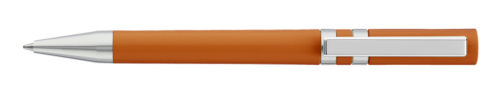 Drehkugelschreiber mit gedeckt glänzendem Gehäuse. Eingelassene Ringe, Stopfen im Oberteil, Metallclip und Spitze in silber glänzend.