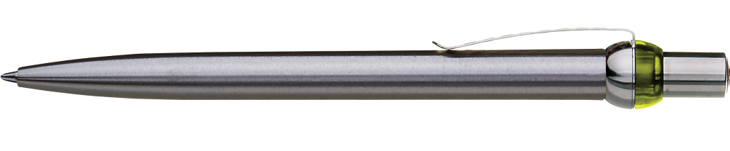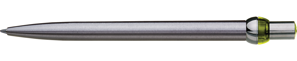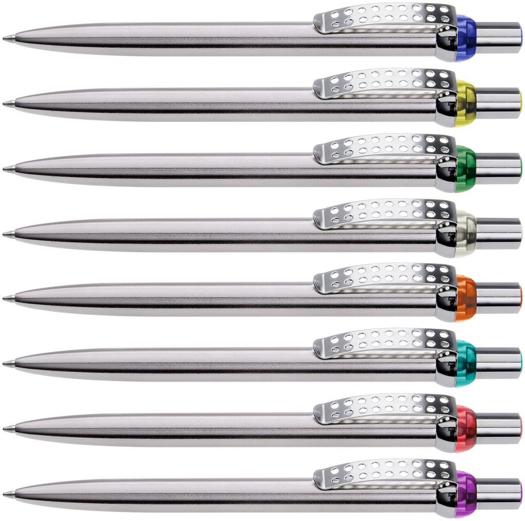 Metall-Druckkugelschreiber mit verchromtem und lackiertem Schaft. Obere Halbkugel und Stopfen farbig transparent. Gelochter Metallclip, Drücker und untere Halbkugel verchromt.