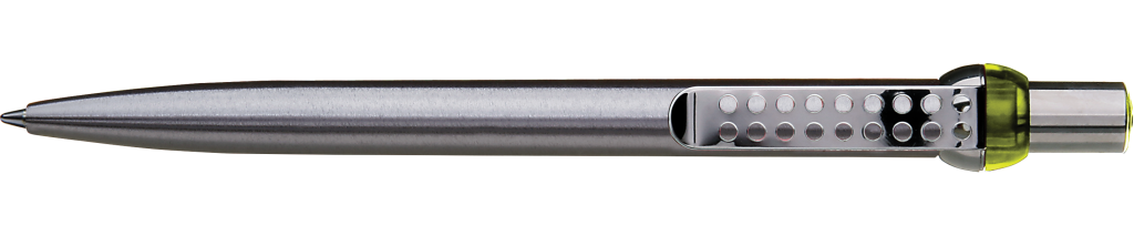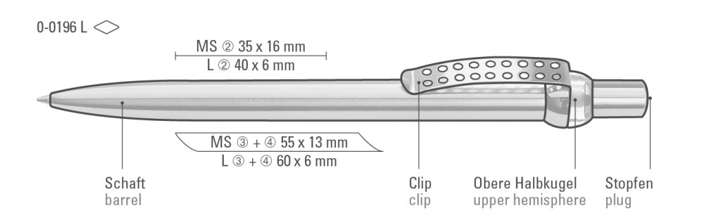 Metall-Druckkugelschreiber mit verchromtem und lackiertem Schaft. Obere Halbkugel und Stopfen farbig transparent. Gelochter Metallclip, Drücker und untere Halbkugel verchromt.Druckbereich: In Clipverlängerung 35mm x 16mm Siebdruck (MS), gegenüber vom Clip 55mm x 13mm Siebdruck (MS), in Clipverlängerung 40mm x 6mm Lasergravur (L), seitlich vom Clip 55mm x 13mm Siebdruck (MS), gegenüber vom Clip 60mm x 6mm Lasergravur (L), seitlich vom Clip 60mm x 6mm Lasergravur (L), in Clipverlängerung 40mm x 6mm Einzelnamensgravur (EL), gegenüber vom Clip 60mm x 6mm Einzelnamensgravur (EL), seitlich vom Clip 60mm x 6mm Einzelnamensgravur (EL)