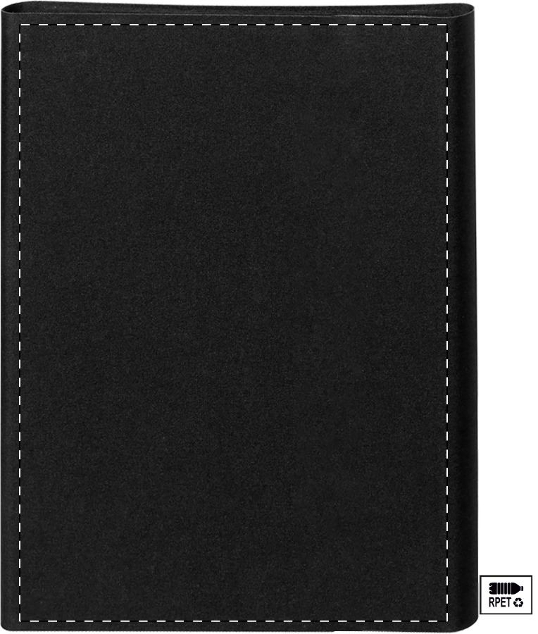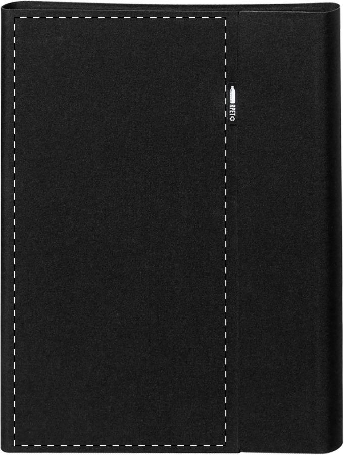 Dokumentenmappe aus 600D RPET-Polyester mit Magnetverschluss, faltbarem Handyhalter und Notizblock mit 20 Seiten (liniert). Mit RPET-Label. Größe A4.