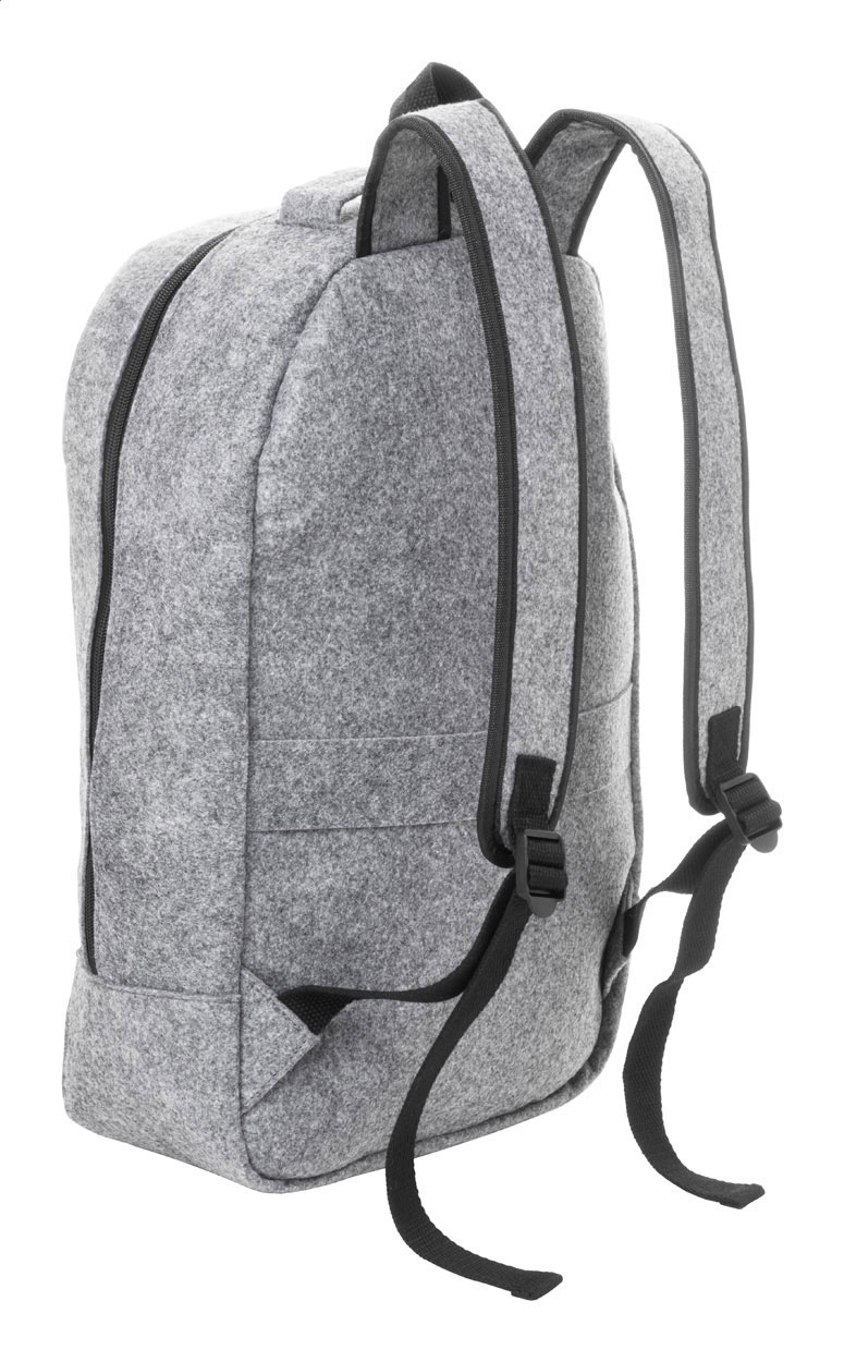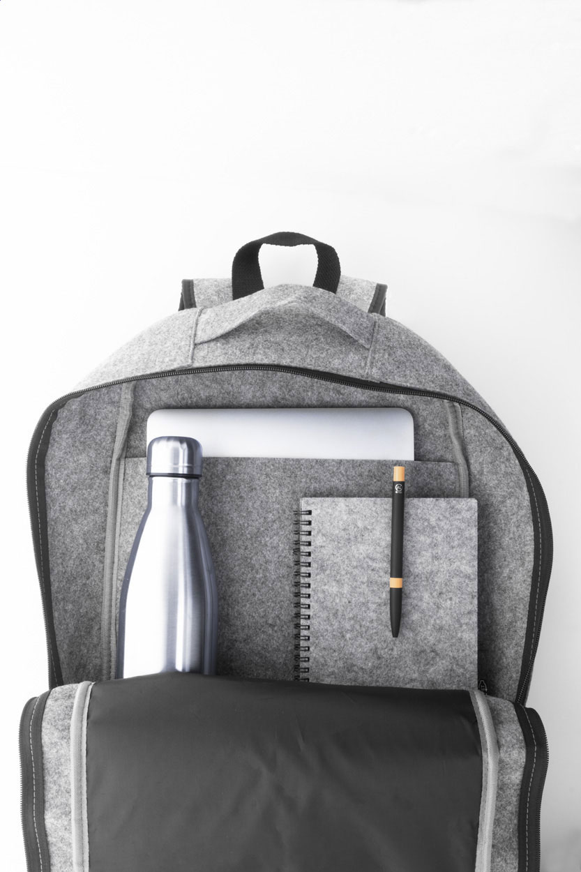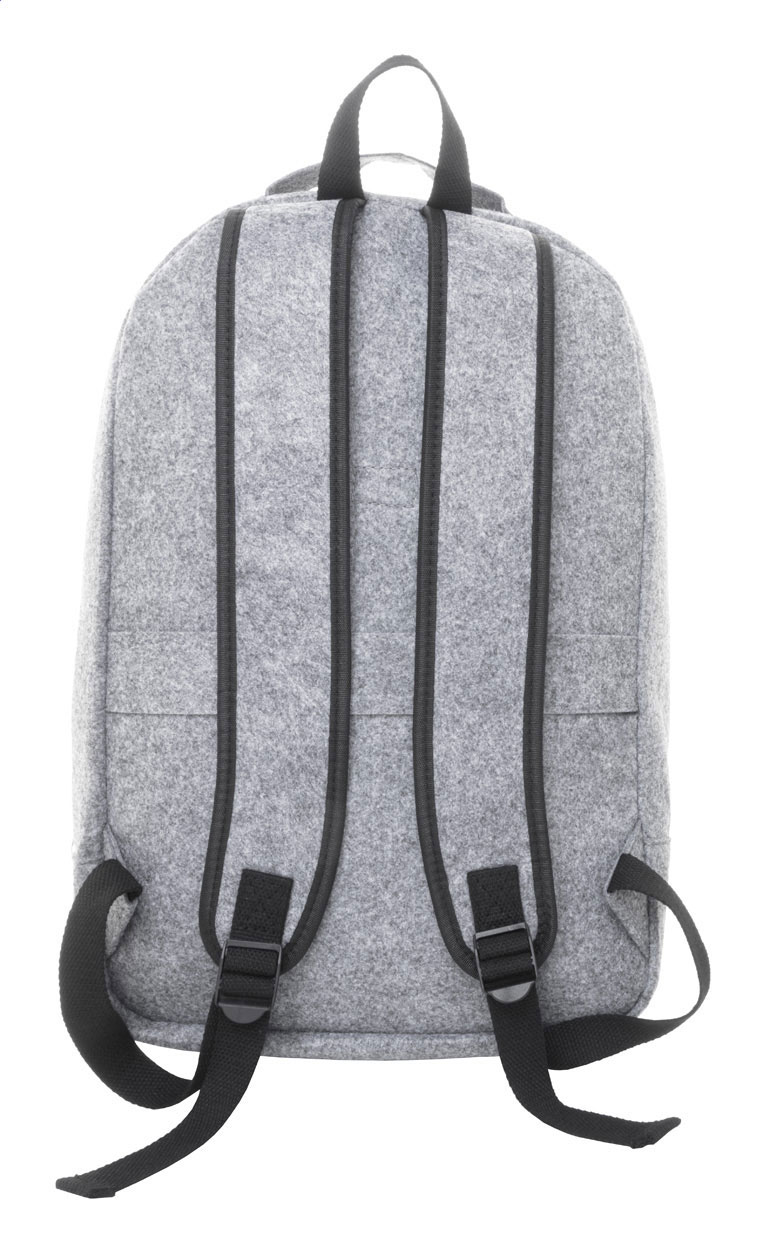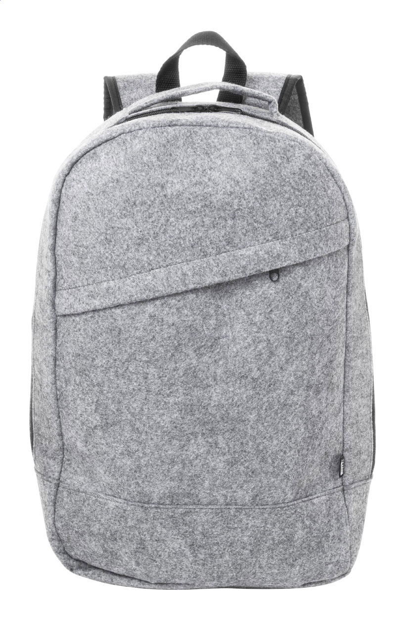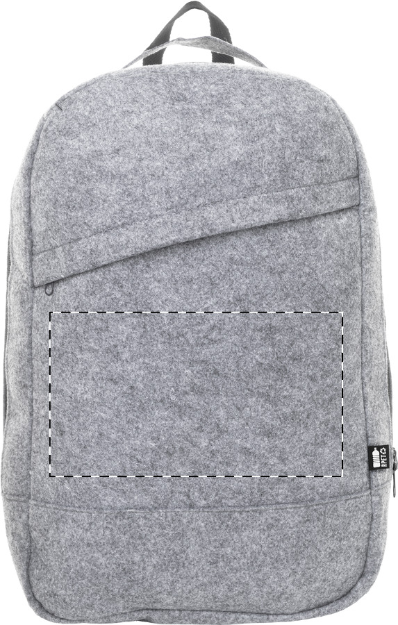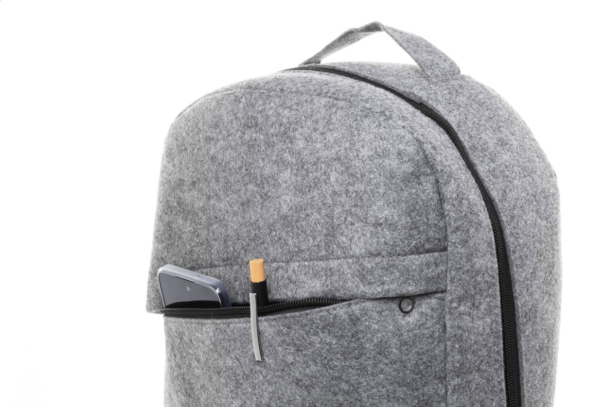 Rucksack aus RPET Filz mit Reißverschluss-Hauptfach, Fronttasche, Laptopfach (15"), Trolley-Befestigungsband und geposterten Schultergurten. Inkl. RPET-Label.