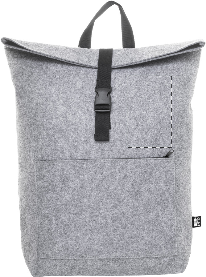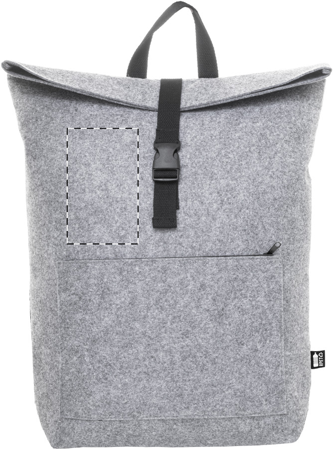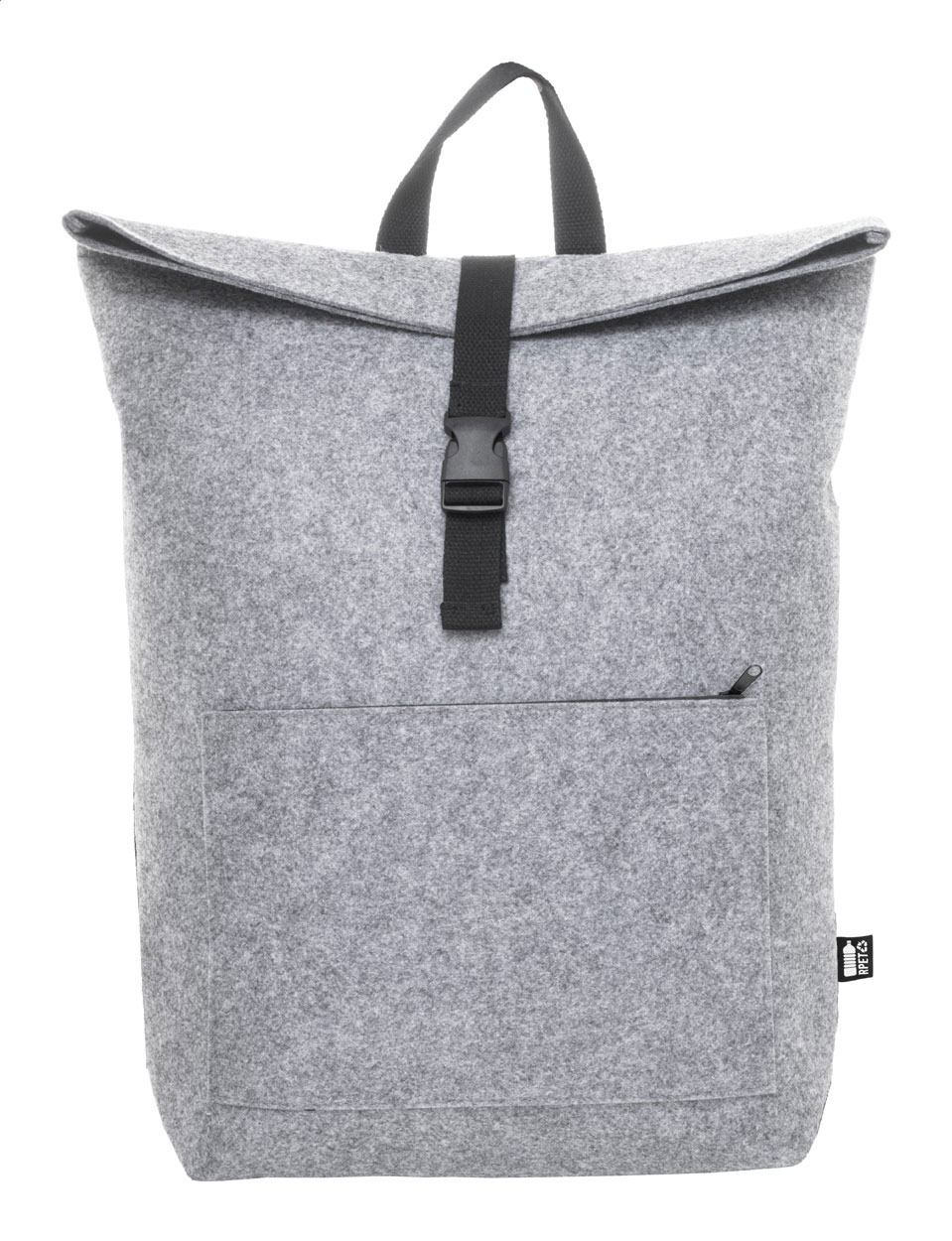 Rolltop-Rucksack aus RPET Filz mit Schnallenverschluss am Hauptfach, Reißverschluss-Fronttasche, Laptopfach (15") und gepolsterten Schultergurten. Inkl. RPET-Label.
