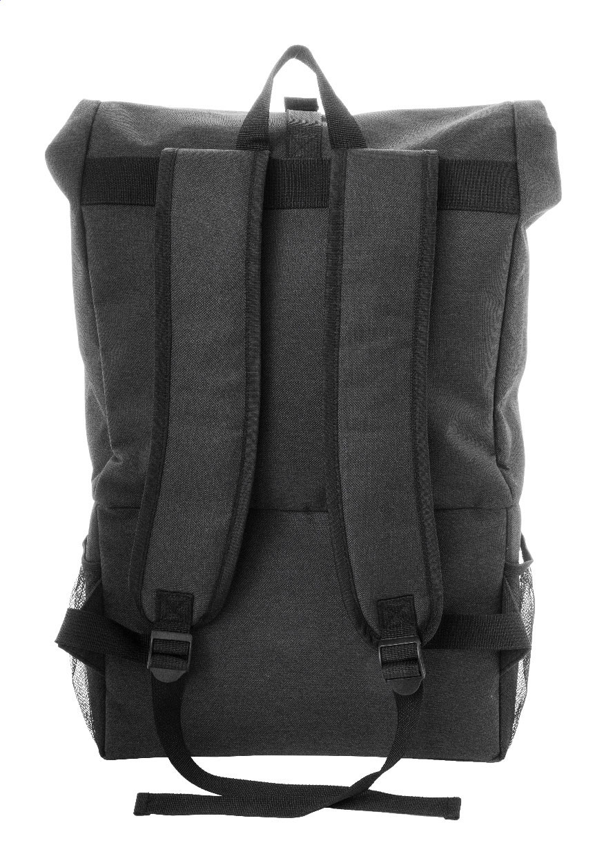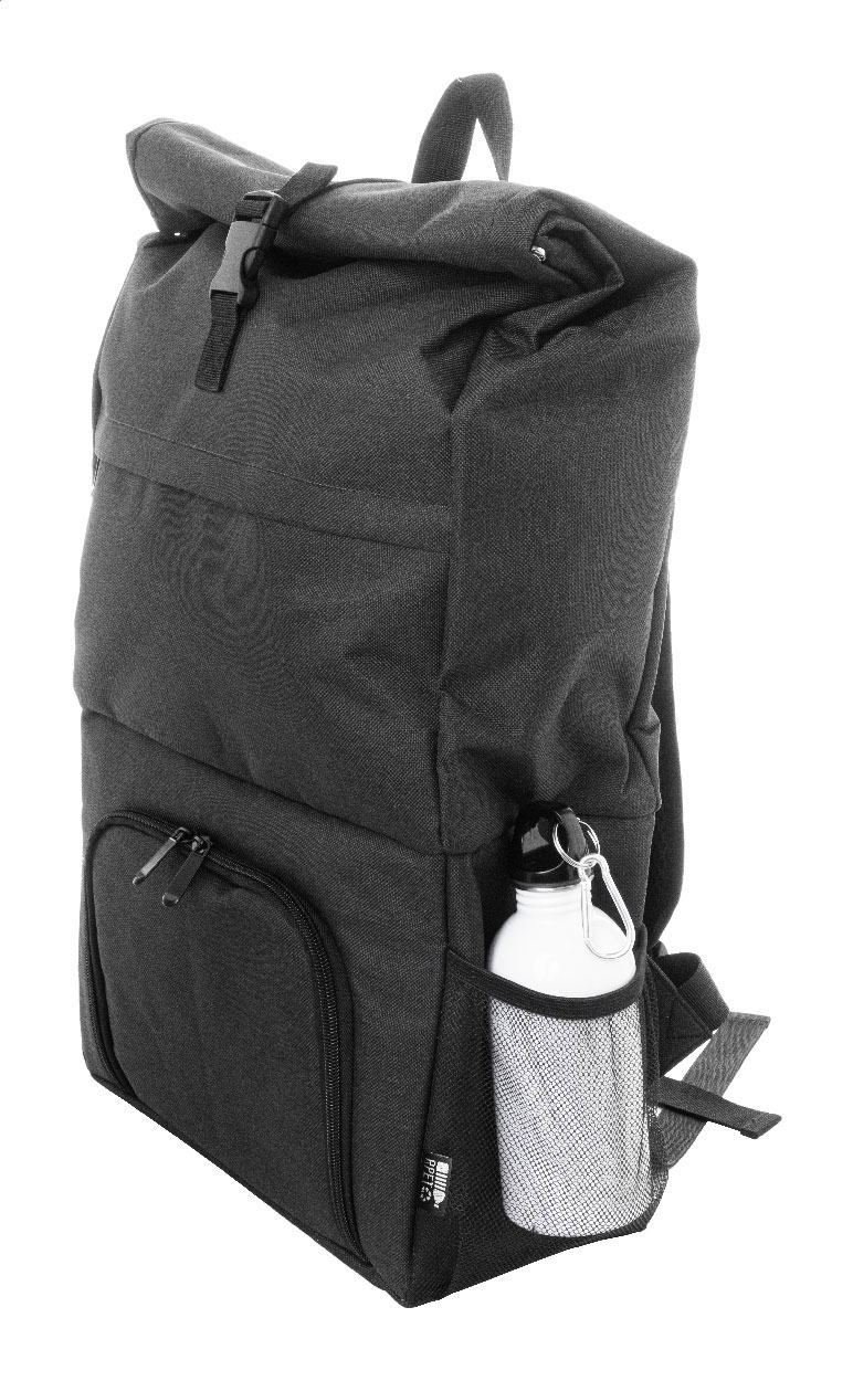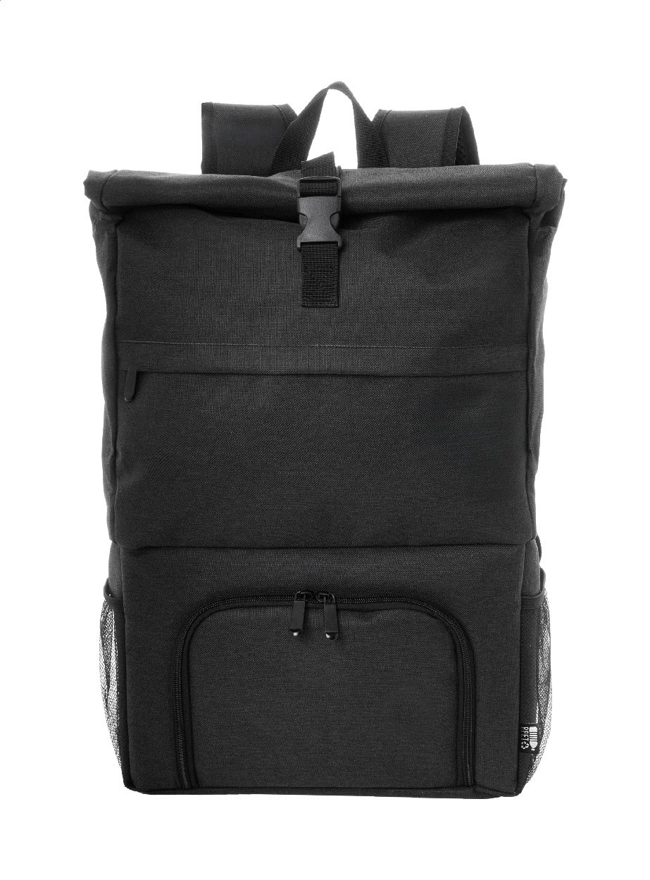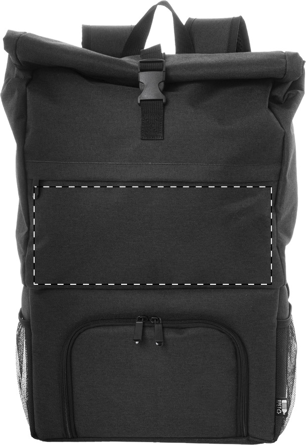 Rolltop RPET-Kühlrucksack mit gepolstertem PEVA-Kühlfach mit Reißverschluss für die Lunchbox. Hauptfach mit Schnallenverschluss, Vordertasche mit Reißverschluss, mit seitlichen Netztaschen und gepolsterten Schulterriemen. Material: 600D RPET-Polyester. Mit RPET-Label.