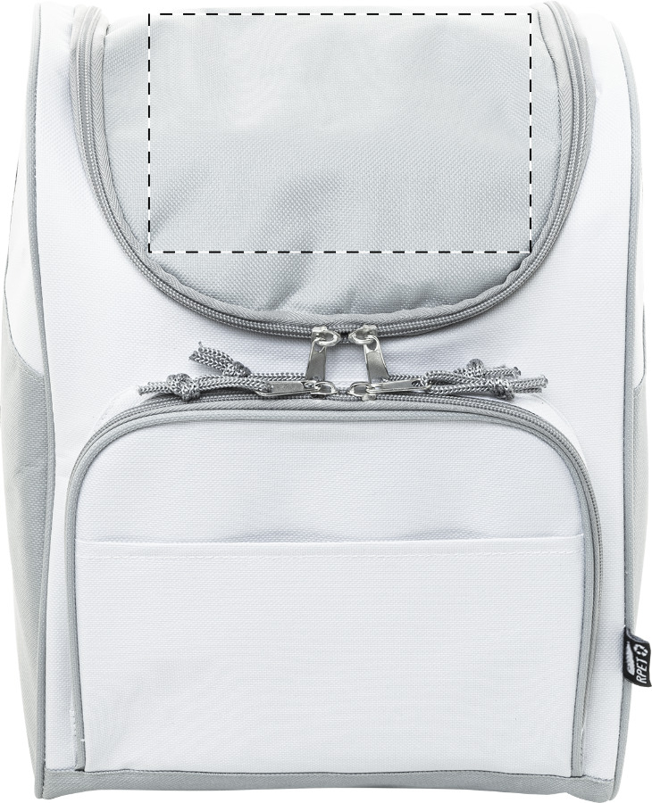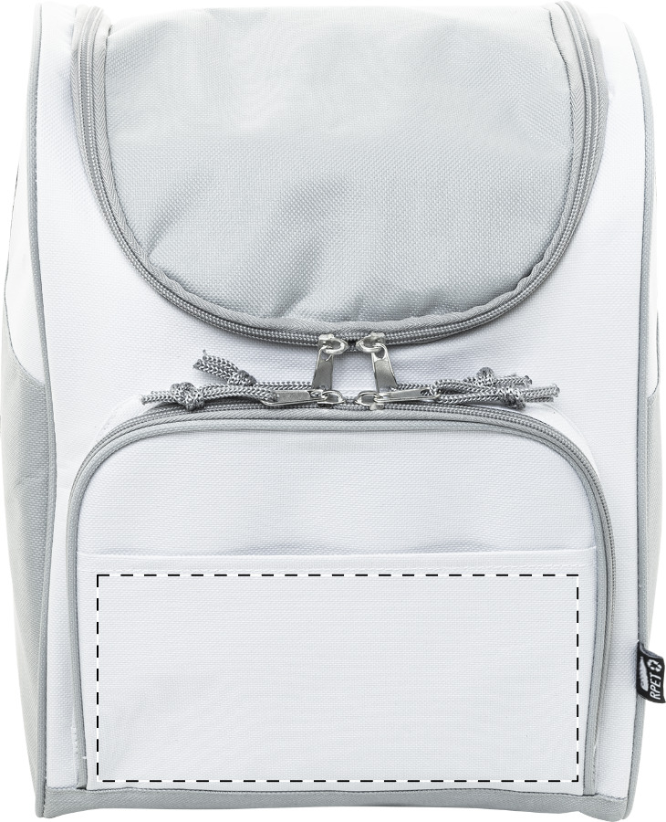 RPET-Kühltasche mit Aluminium-Polsterung. Mit 2 Reißverschlussfächern, kleiner Fronttasche und verstellbarem Schultergurt. Material: 600D RPET-Polyester. Mit RPET-Label.