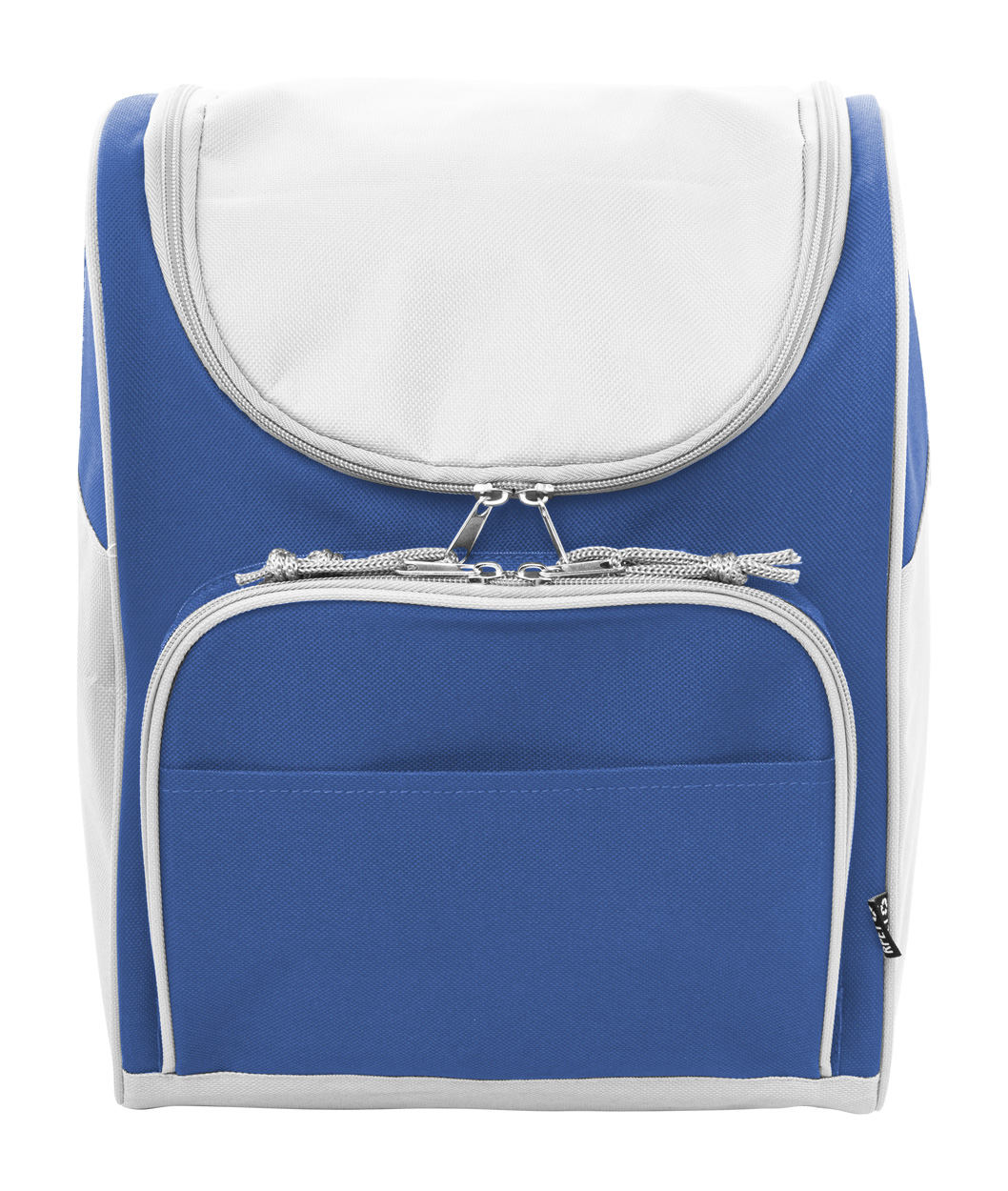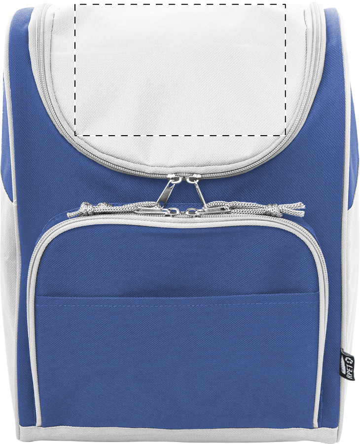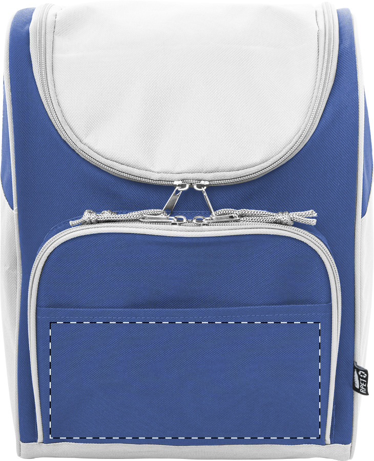 RPET-Kühltasche mit Aluminium-Polsterung. Mit 2 Reißverschlussfächern, kleiner Fronttasche und verstellbarem Schultergurt. Material: 600D RPET-Polyester. Mit RPET-Label.