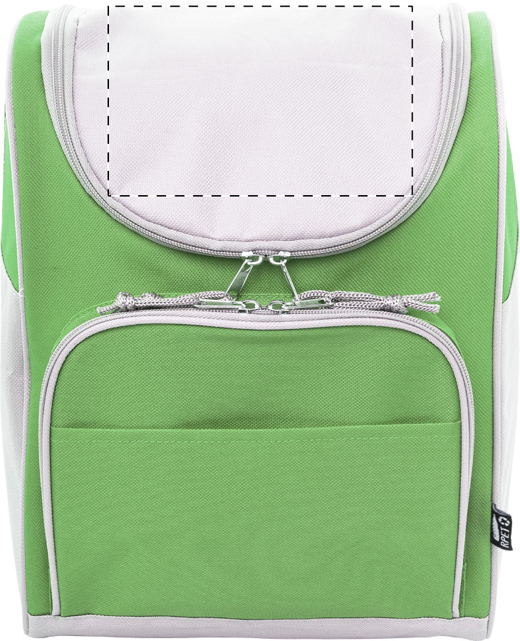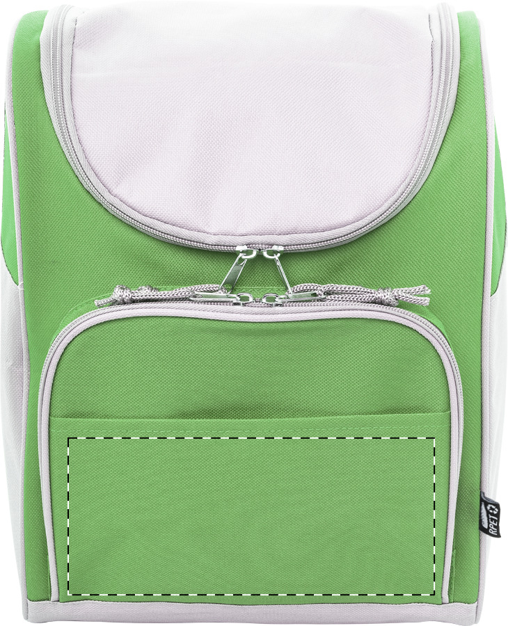 RPET-Kühltasche mit Aluminium-Polsterung. Mit 2 Reißverschlussfächern, kleiner Fronttasche und verstellbarem Schultergurt. Material: 600D RPET-Polyester. Mit RPET-Label.