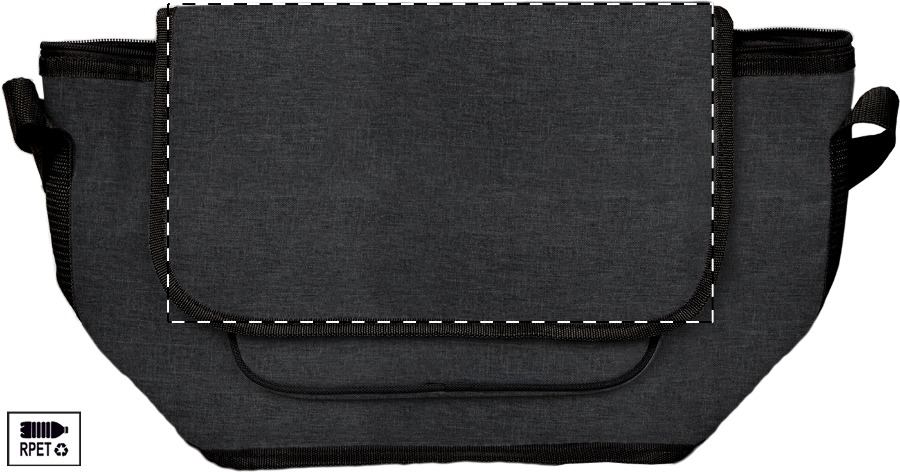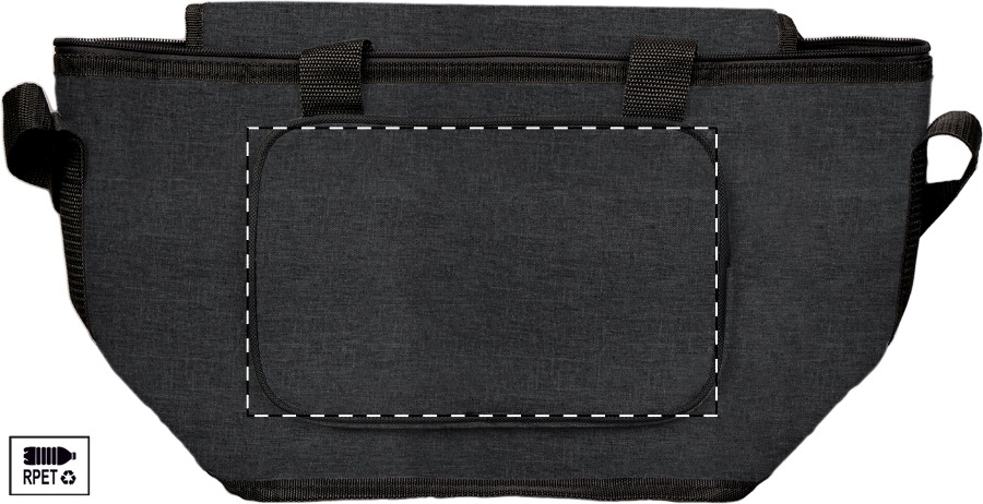 RPET Kühltasche mit PEVA-Polsterung, Reißverschlussfächern, Henkel mit Klettverschluss und verstellbarem Schultergurt. Material: 600D RPET Polyester (mit RPET-Label).