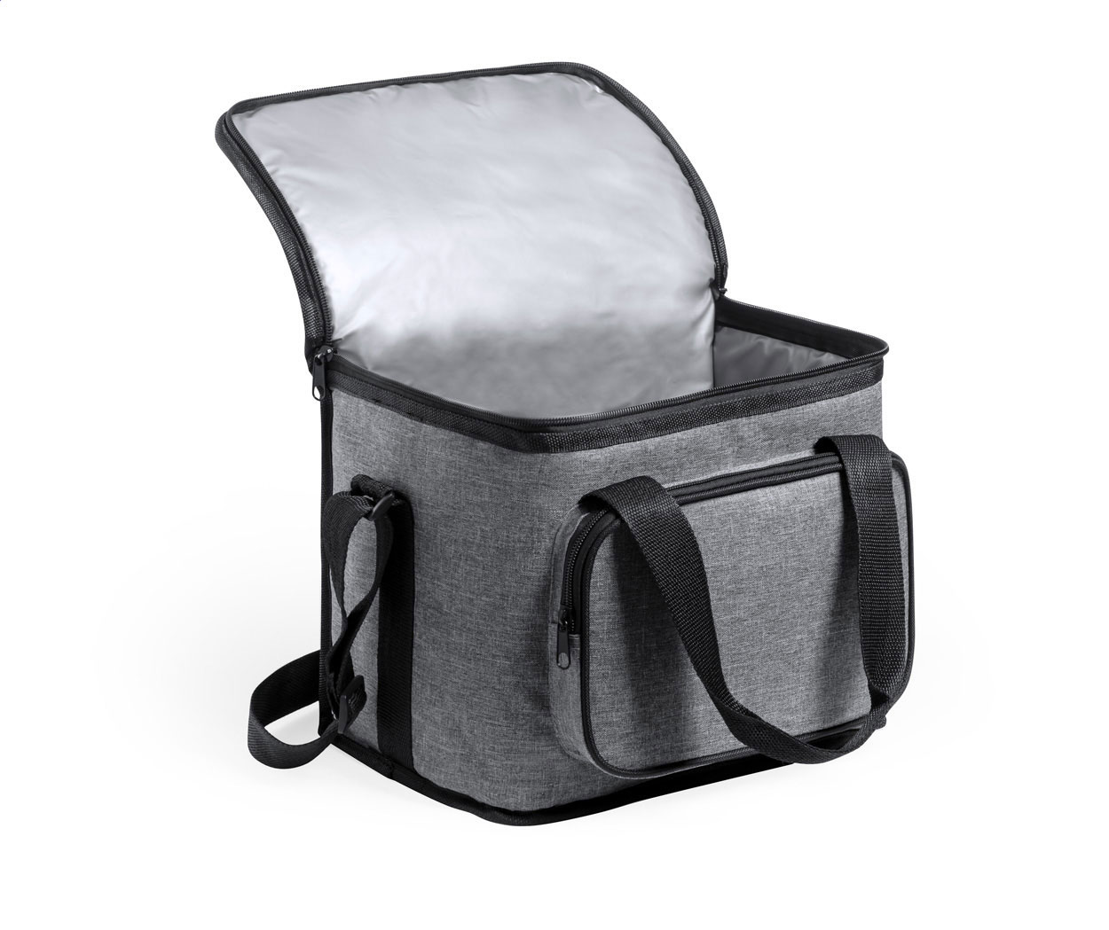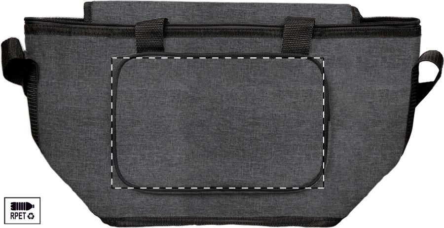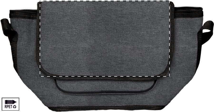 RPET Kühltasche mit PEVA-Polsterung, Reißverschlussfächern, Henkel mit Klettverschluss und verstellbarem Schultergurt. Material: 600D RPET Polyester (mit RPET-Label).
