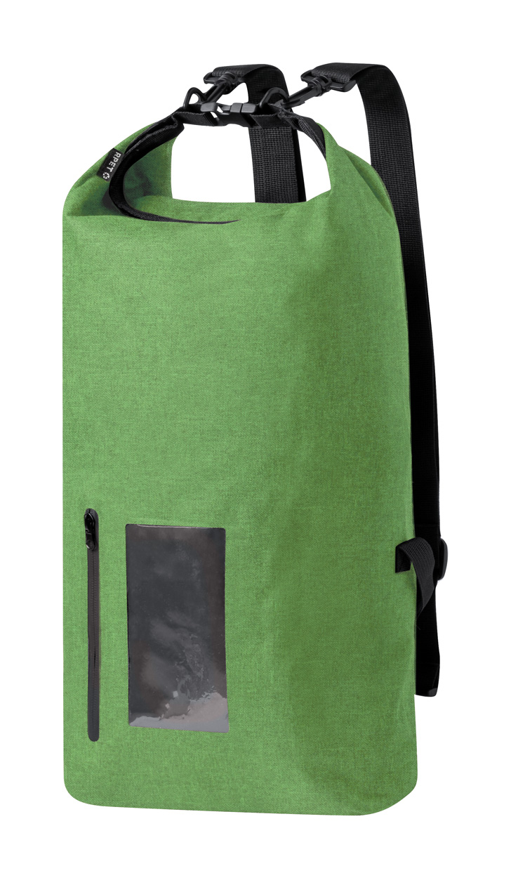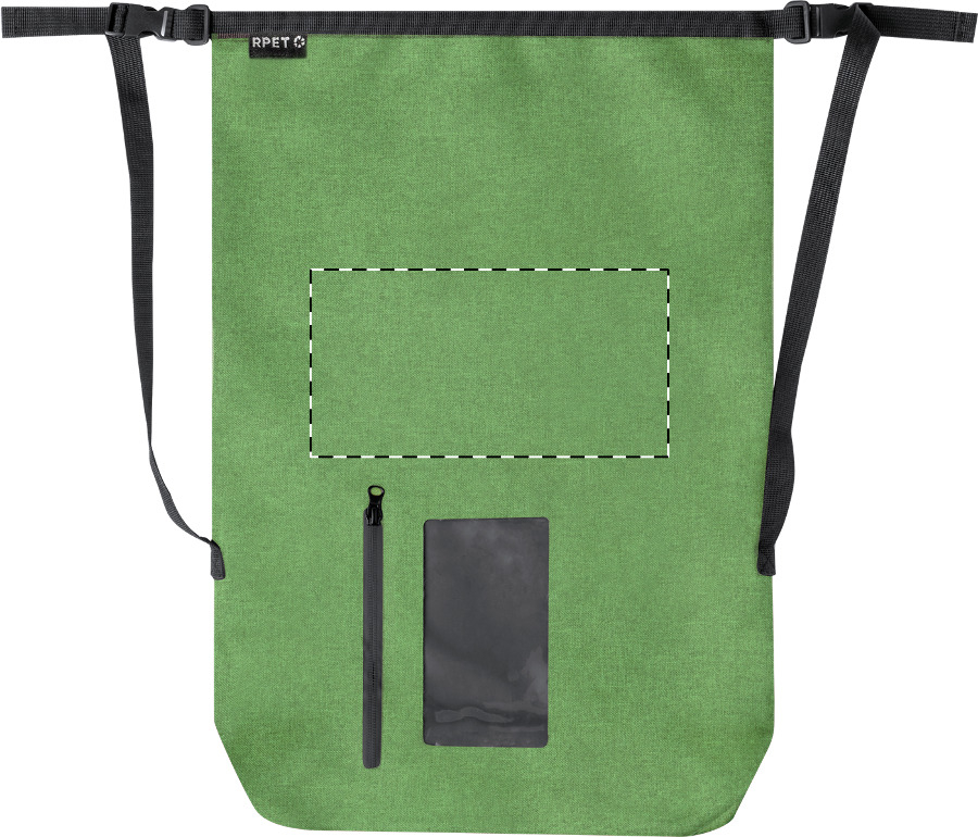 Wasserdichter Matchsack/Rucksack aus 300D RPET-Polyester mit Reißverschlusstasche (touchscreenfähig) und verstellbaren Schultergurten. Fassungsvermögen: 25l.
