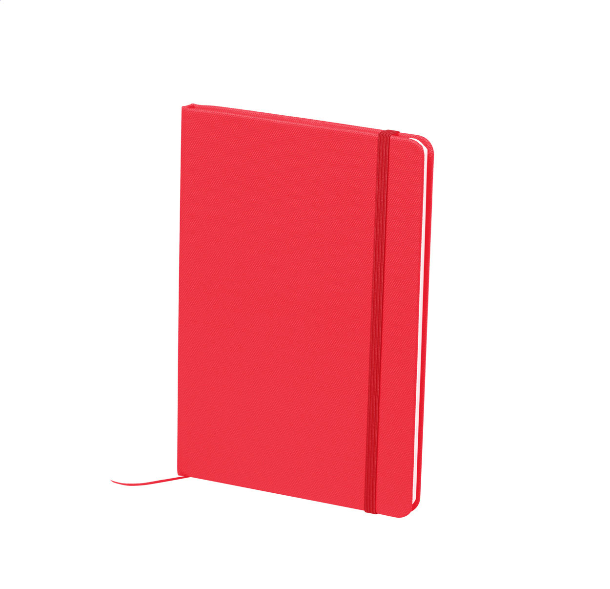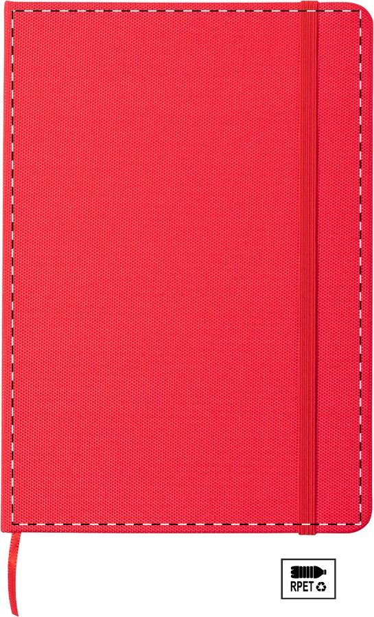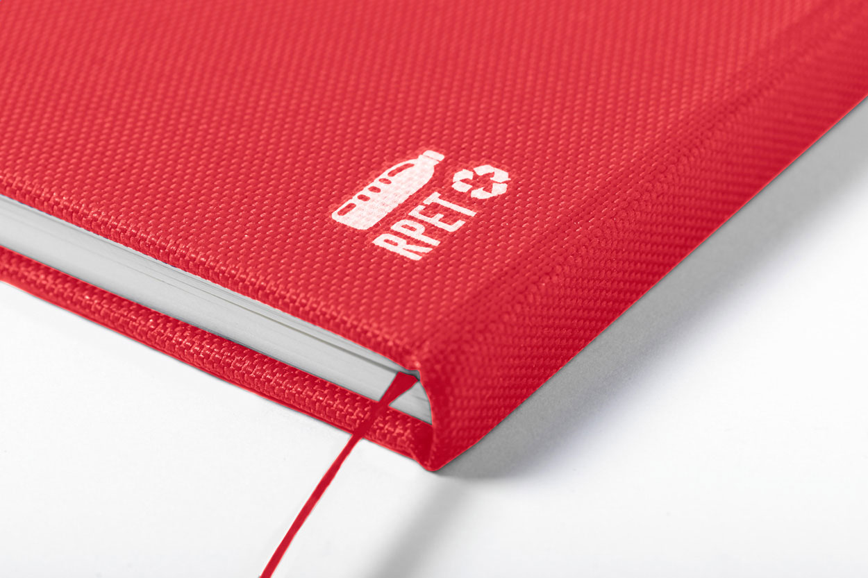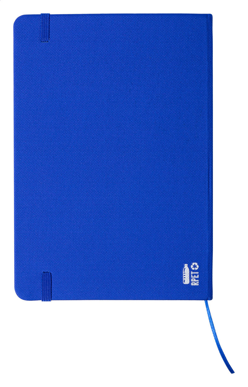Notizbuch mit RPET-Polyester überzogen, mit 80 Seiten (liniert), Lesezeichen und Gummiband. Größe A5.