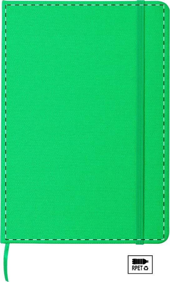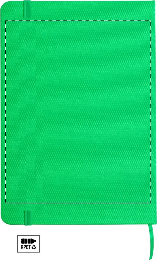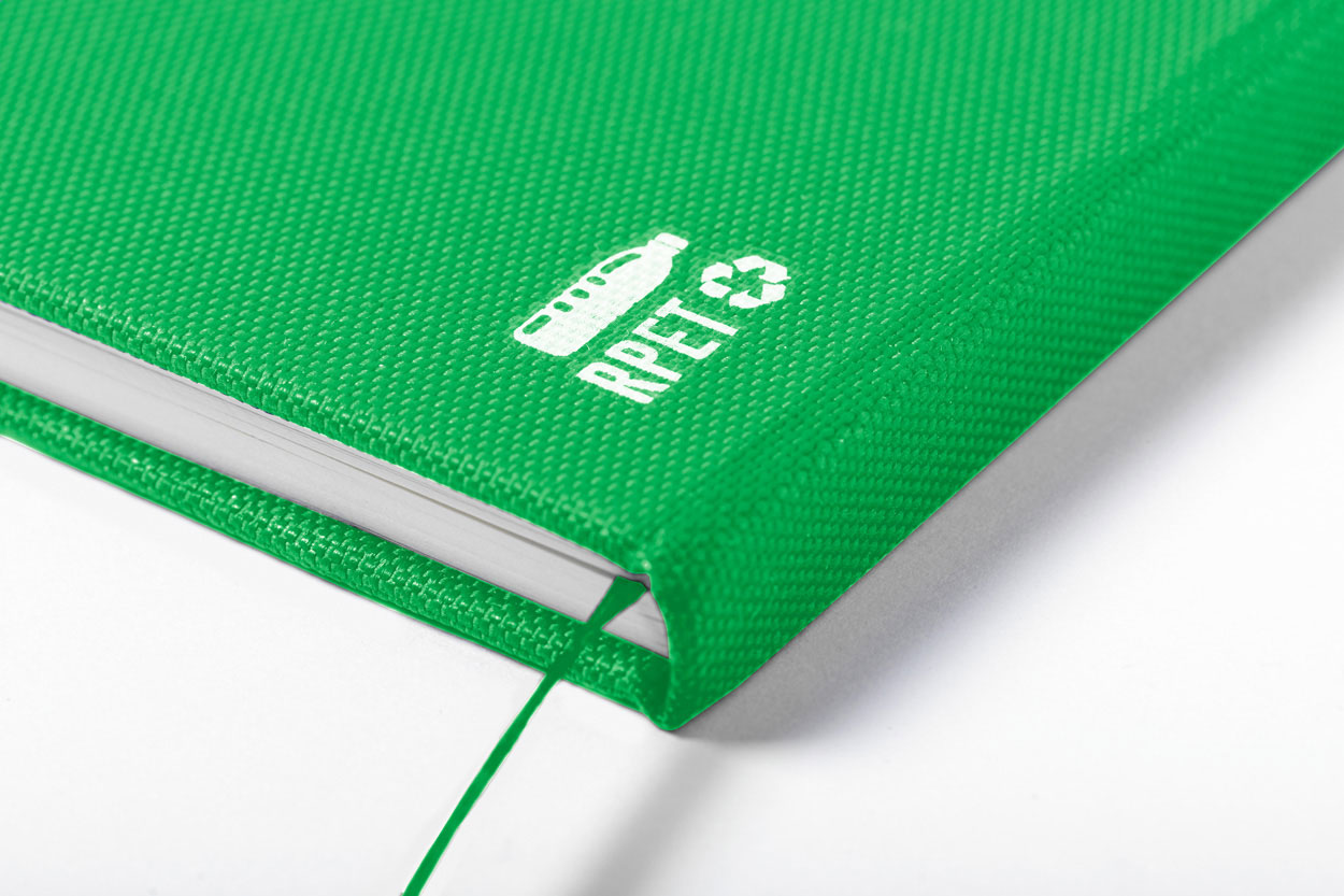 Notizbuch mit RPET-Polyester überzogen, mit 80 Seiten (liniert), Lesezeichen und Gummiband. Größe A5.