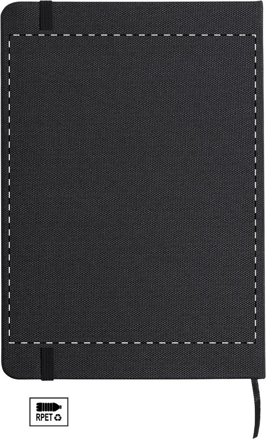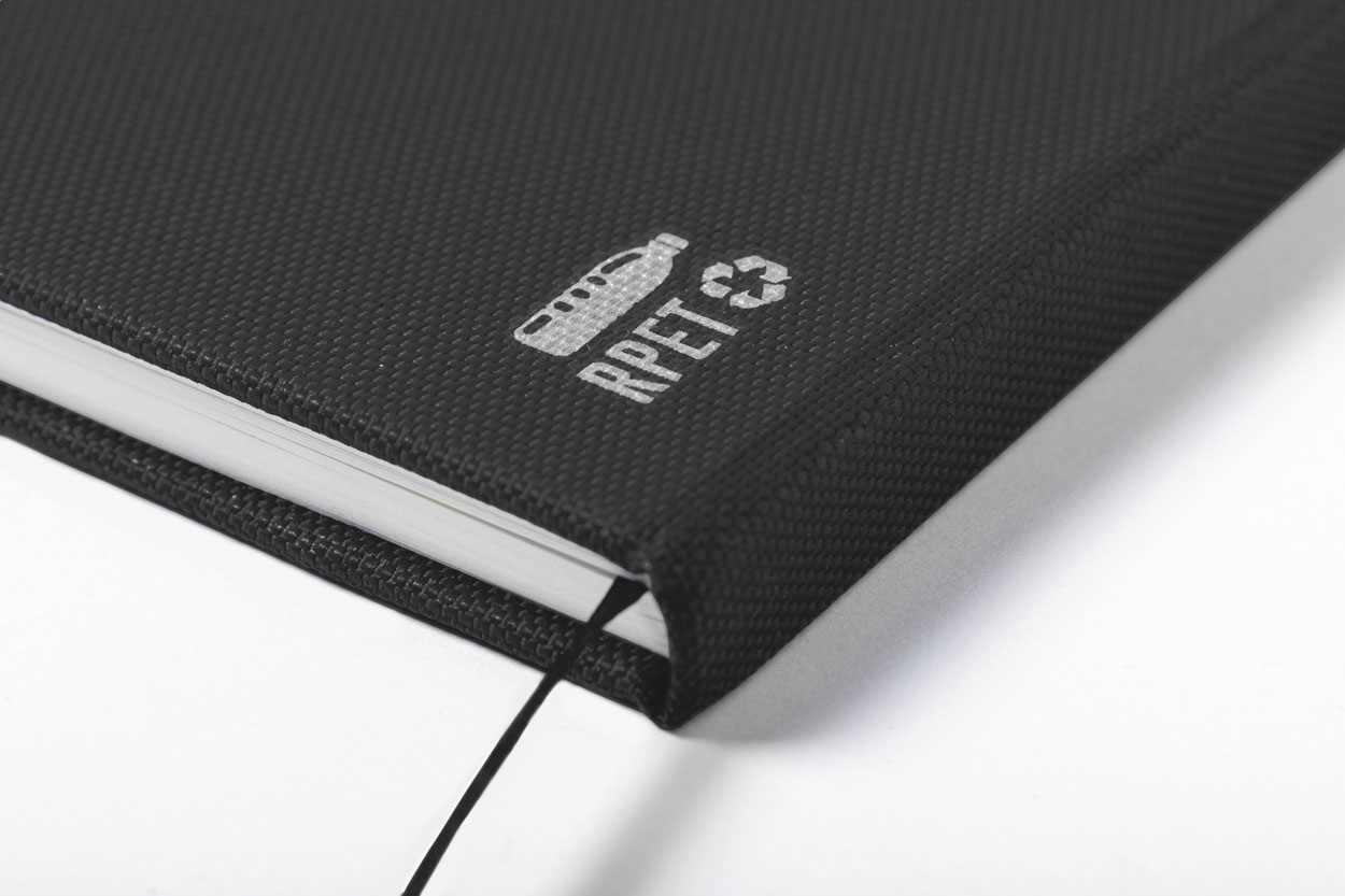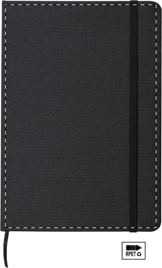 Notizbuch mit RPET-Polyester überzogen, mit 80 Seiten (liniert), Lesezeichen und Gummiband. Größe A5.