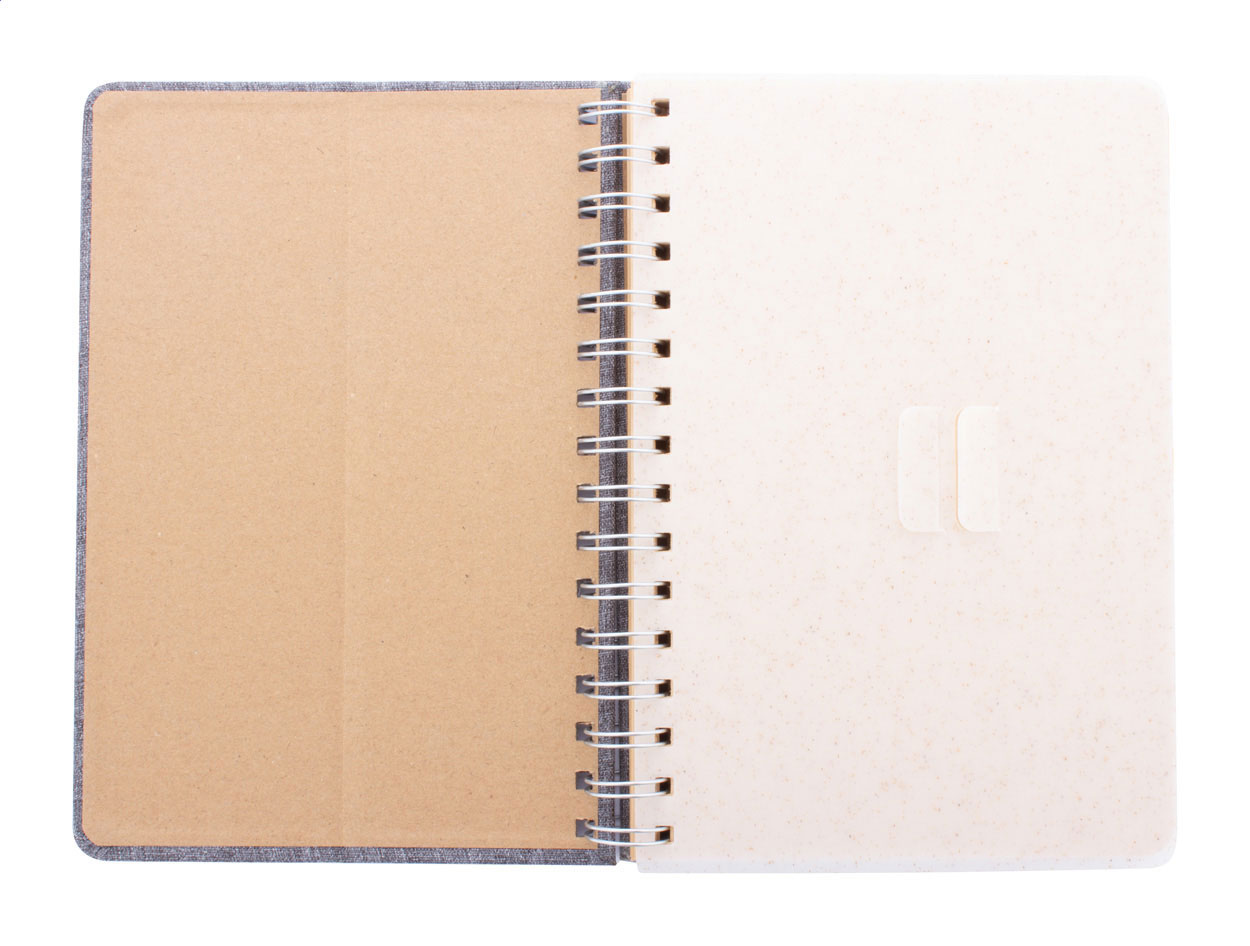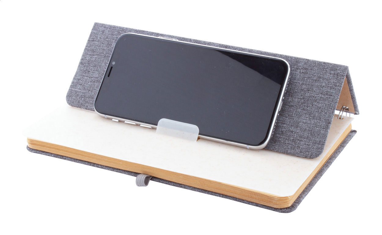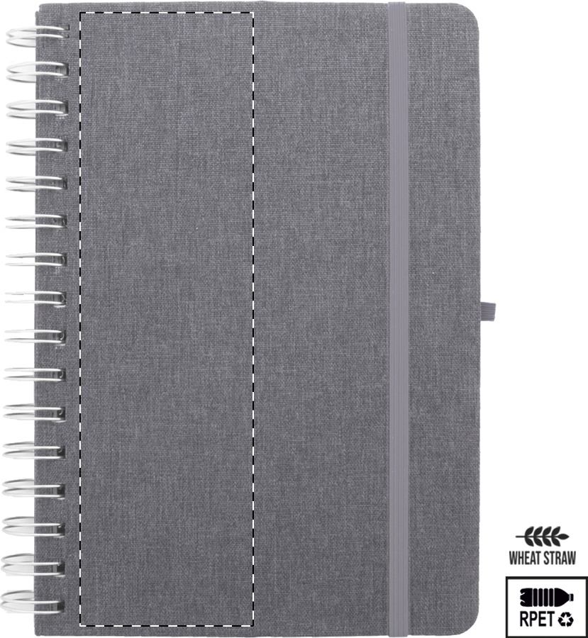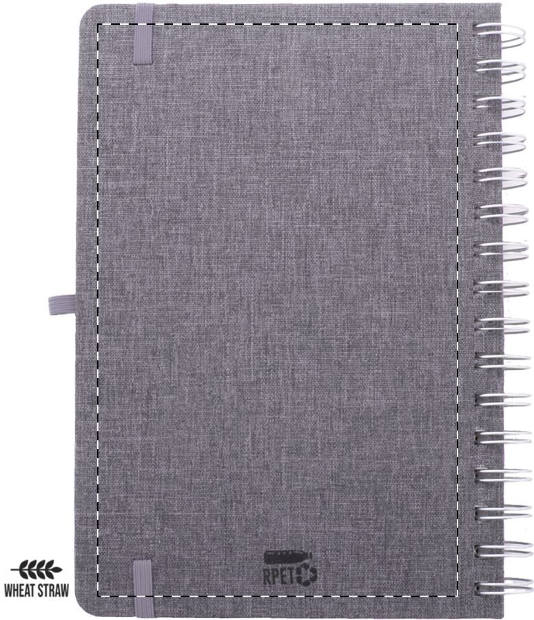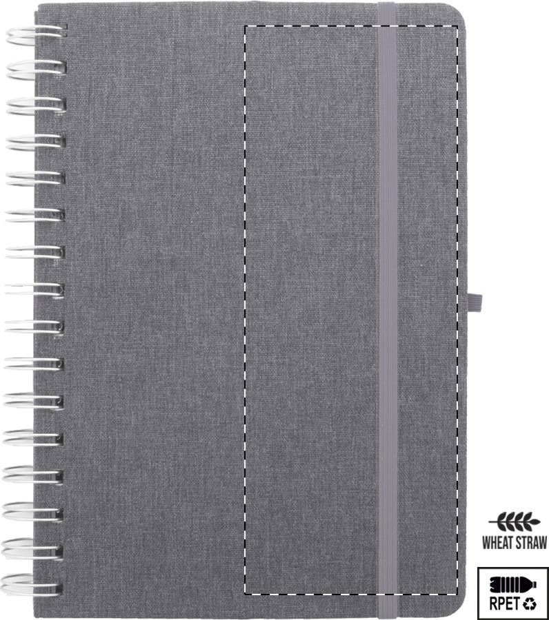 A5 Spiral-Notizbuch mit Umschlag aus RPET Polyester, Handy- und Tablethaltereinsatz aus Weizenstrohkunststoff, 70 linierten Seiten aus recycletem Kraftpapier, Gummiband und Stifteschlaufe.Maße: 150×210×15 mmFormat: A5Papiertyp Notizbücher: Linierte SeitenPapiergewicht: 70 g/m2Material: Recyceltes PET Polyester, Recycling Papier, Weizenstroh, Gummi, KunststoffVeredelungsposition 1: RückseiteTechnologie: Digital-TransferdruckDurchmesser: 0Druckcode: DTBTechnologie: Digitaltransfer - EinzelnamenDurchmesser: 0Druckcode: NDTBTechnologie: SiebdruckMaximale Farben: 2Durchmesser: 0Druckcode: S1Technologie: TransferdruckMaximale Farben: 8Durchmesser: 0Druckcode: TBVeredelungsposition 2: Vorderseite - rechtsTechnologie: Digital-TransferdruckDurchmesser: 0Druckcode: DTBTechnologie: Digitaltransfer - EinzelnamenDurchmesser: 0Druckcode: NDTBTechnologie: SiebdruckMaximale Farben: 2Durchmesser: 0Druckcode: S1Technologie: TransferdruckMaximale Farben: 8Durchmesser: 0Druckcode: TBVeredelungsposition 3: Vorderseite - links (über dem Herzen)Technologie: Digital-TransferdruckDurchmesser: 0Druckcode: DTBTechnologie: Digitaltransfer - EinzelnamenDurchmesser: 0Druckcode: NDTBTechnologie: SiebdruckMaximale Farben: 2Durchmesser: 0Druckcode: S1Technologie: TransferdruckMaximale Farben: 8Durchmesser: 0Druckcode: TB