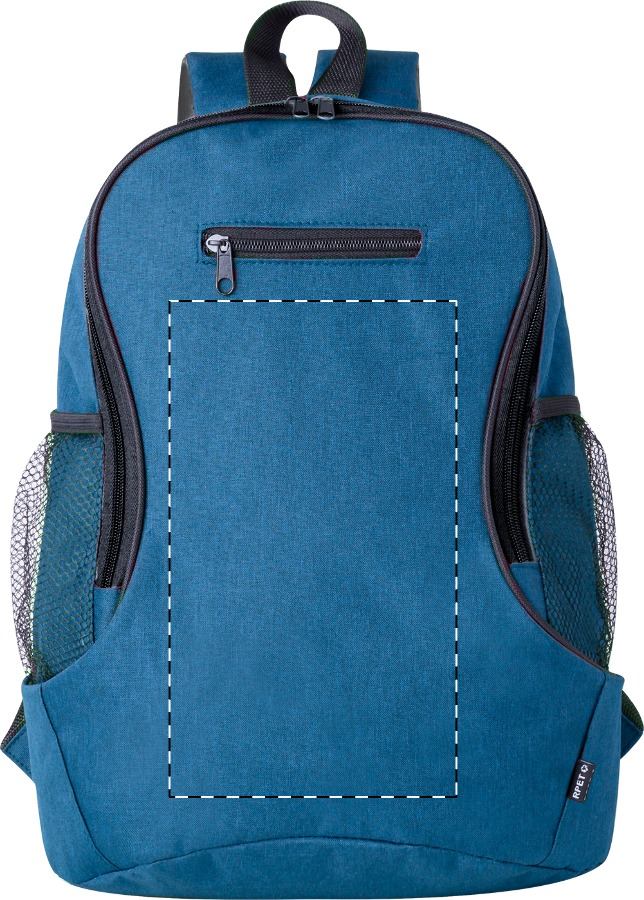 RPET-Rucksack mit Reißverschlussfach, Vordertasche, seitliche Netztaschen, gepolstertem Rücken und Schultergurten. Material: 300D RPET-Polyester. Mit RPET-Label.