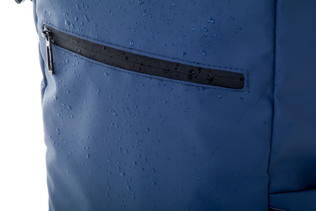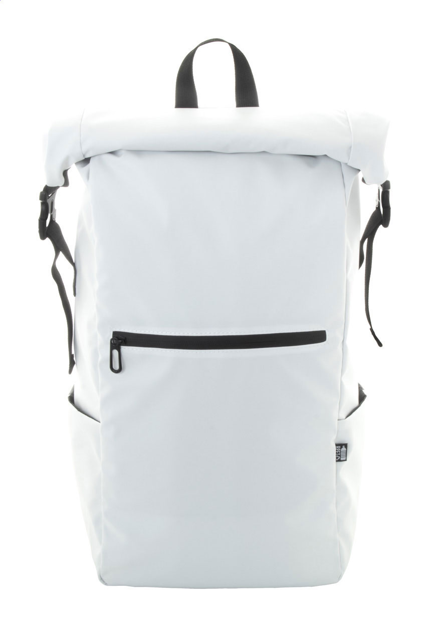 Wasserdichter Rolltop-Rucksack aus RPET mit Schnalle und Klettverschluss, gepolstertem Laptop- (16") und Tabletfach (10"), Reißverschlusstasche vorne, Seitentaschen, gepolstertem Rücken und Schultergurten. Material: PU beschichtetes 600D RPET-Polyester. Mit RPET-Label.