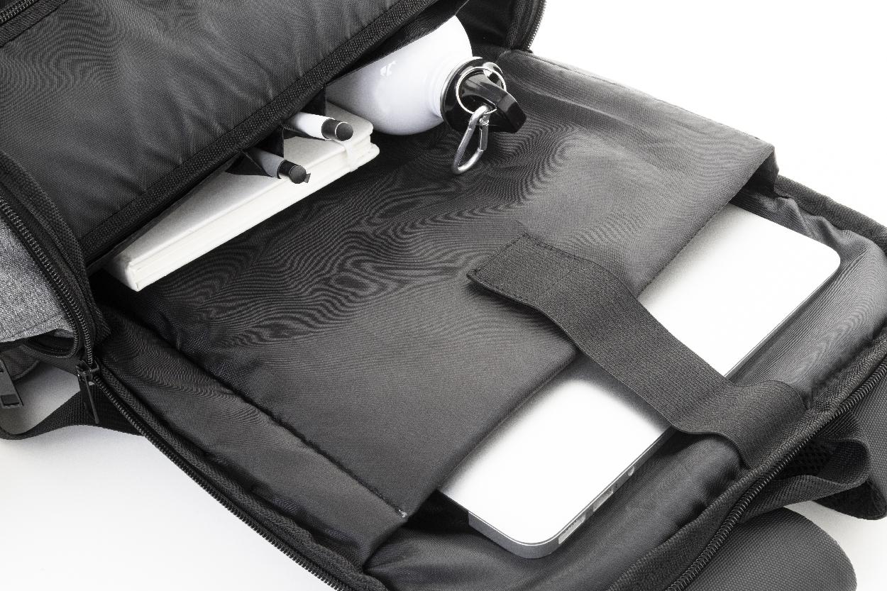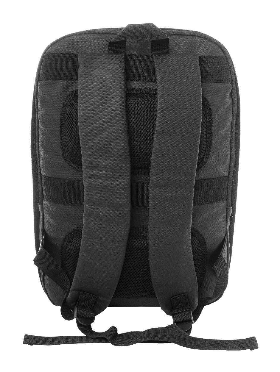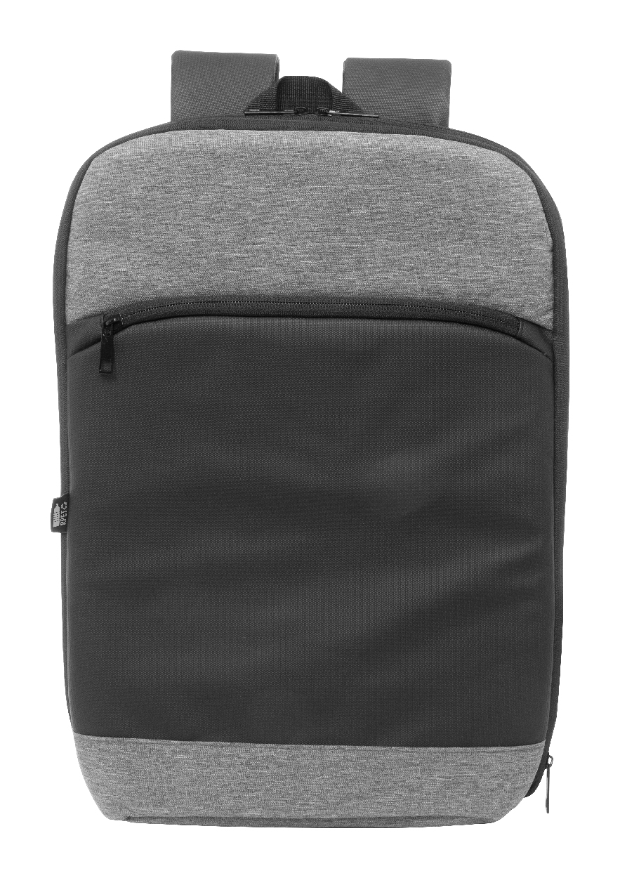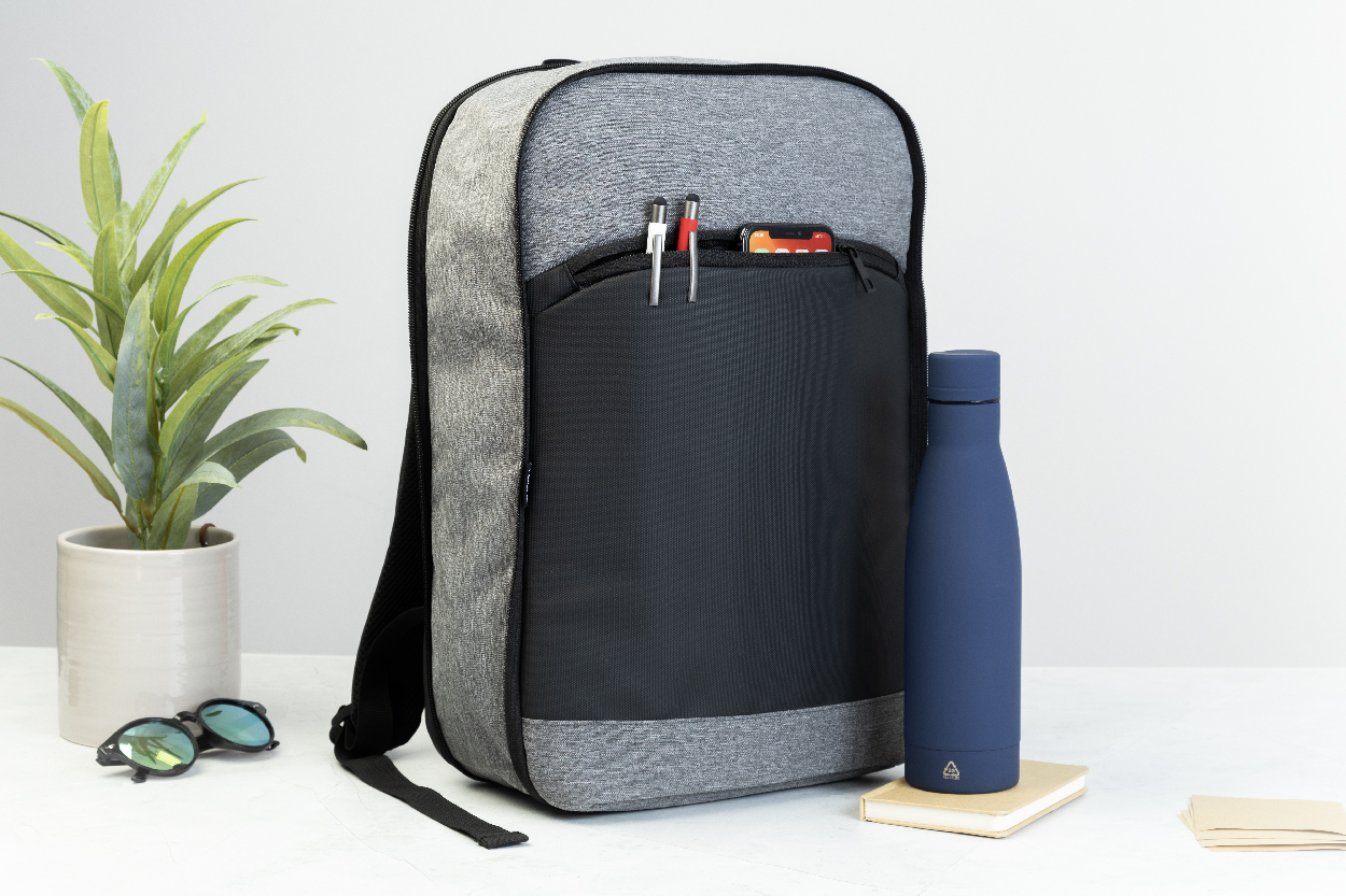 Erweiterbarer RPET-Rucksack mit Reißverschluss-Hauptfach, Reißverschluss-Vortasche, gepolstertem Laptopfach (15") und PU-beschichteter Vorderseite. Mit Trolley-Gurt, gepolstertem Rücken und Schultergurten. Material: 600D RPET-Polyester. Mit RPET-Label.