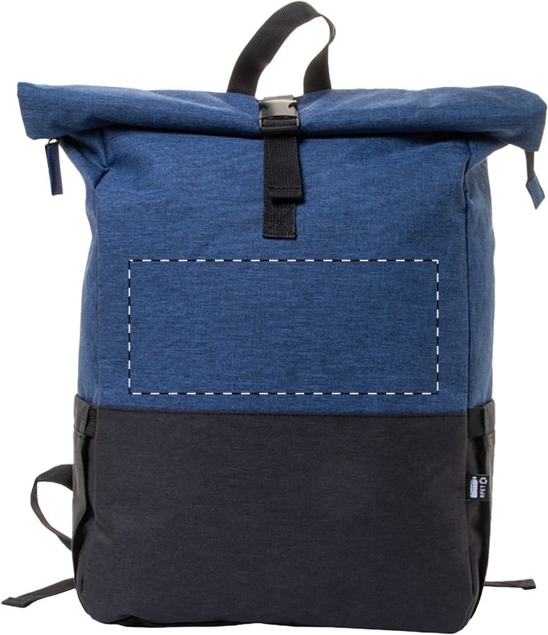Zweifarbiger RPET-Rolltop-Rucksack mit Schnallenverschluss, Hauptfach mit Reißverschluss, gepolstertem Laptop- (15") und Tablet-Fach (10"), Seitentaschen, gepolstertem Rücken und Schultergurten. 300D RPET-Polyester mit markantem RPET-Label.