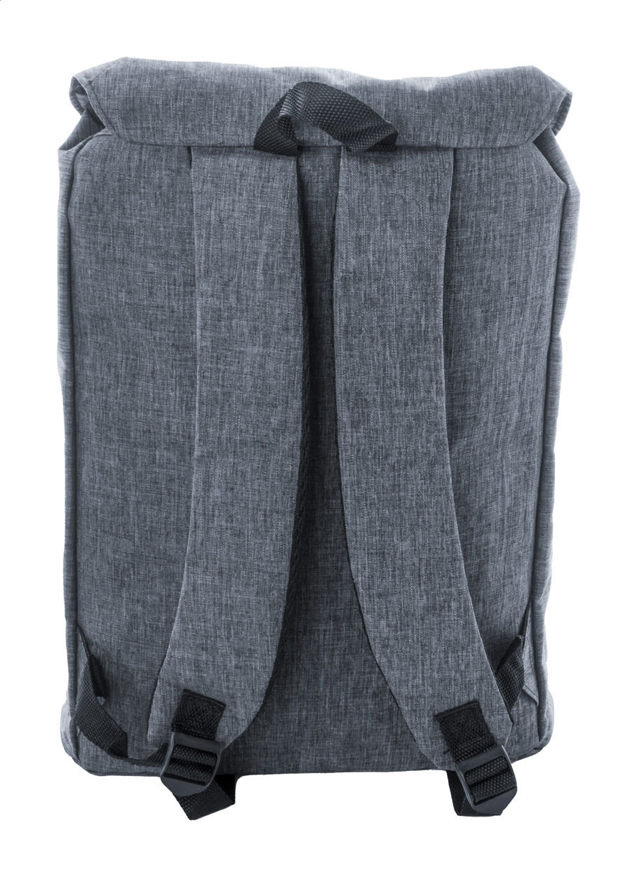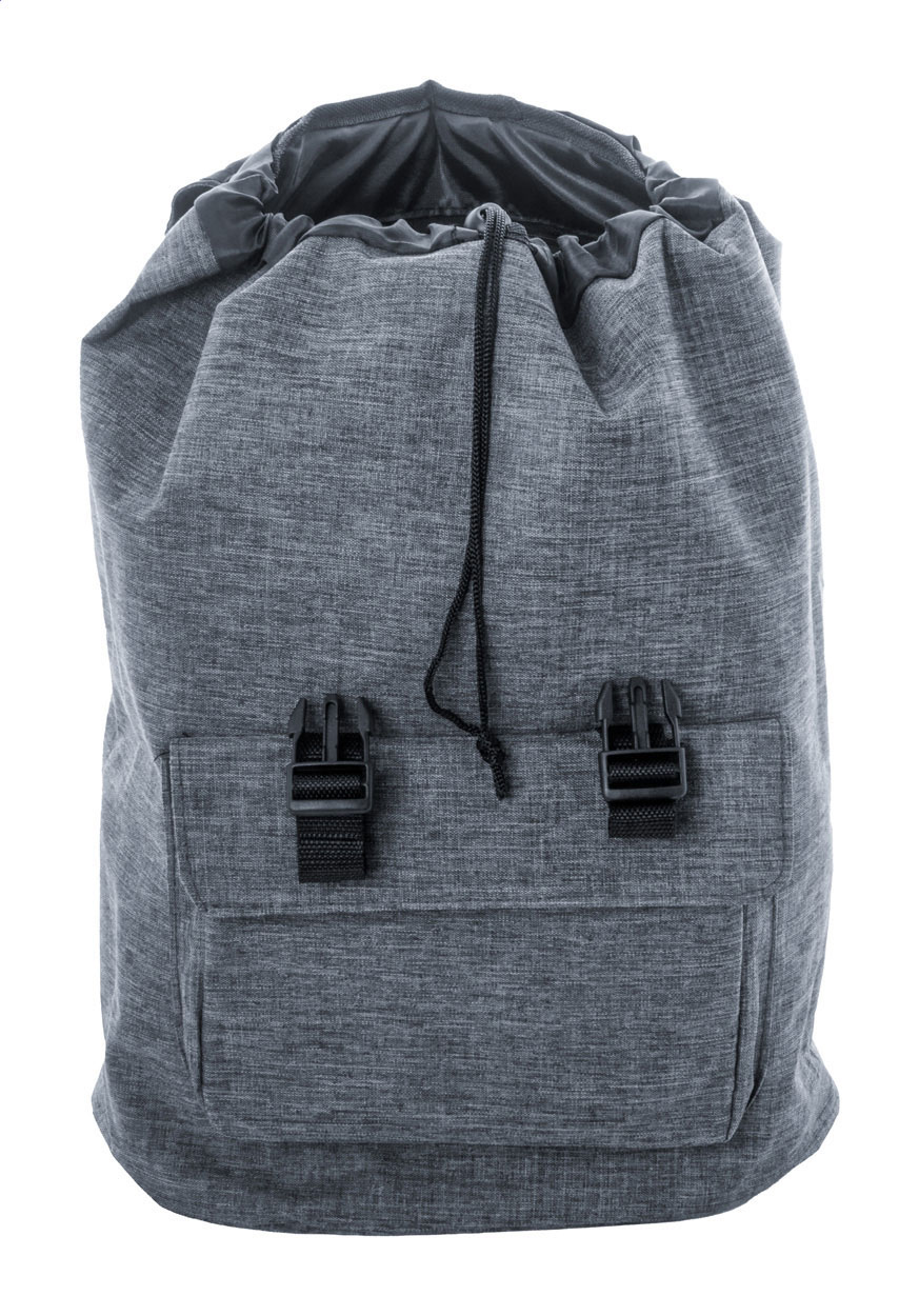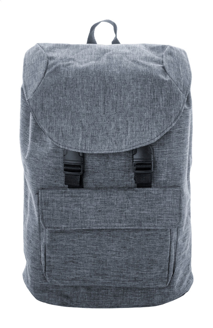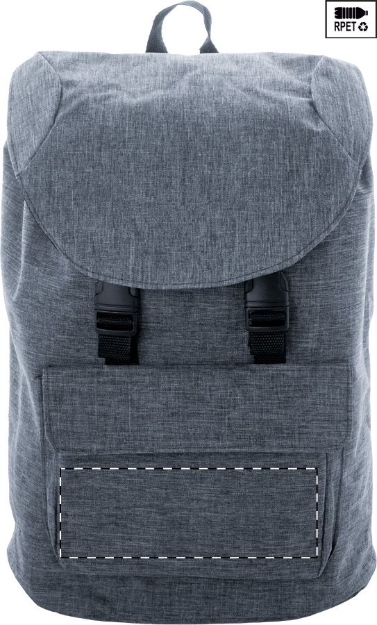 Rucksack aus RPET mit Schnallen- und Kordelzugverschluss, Klettverschlusstasche vorne, gepolstertem Laptopfach (16"), gepolstertem Rücken und Schultergurten. Material: 300D RPET-Polyester. Mit RPET-Label.