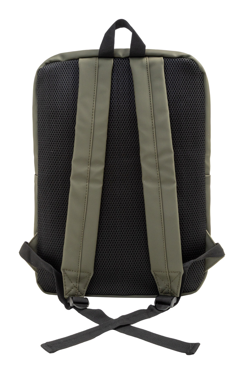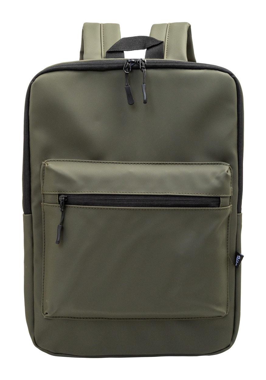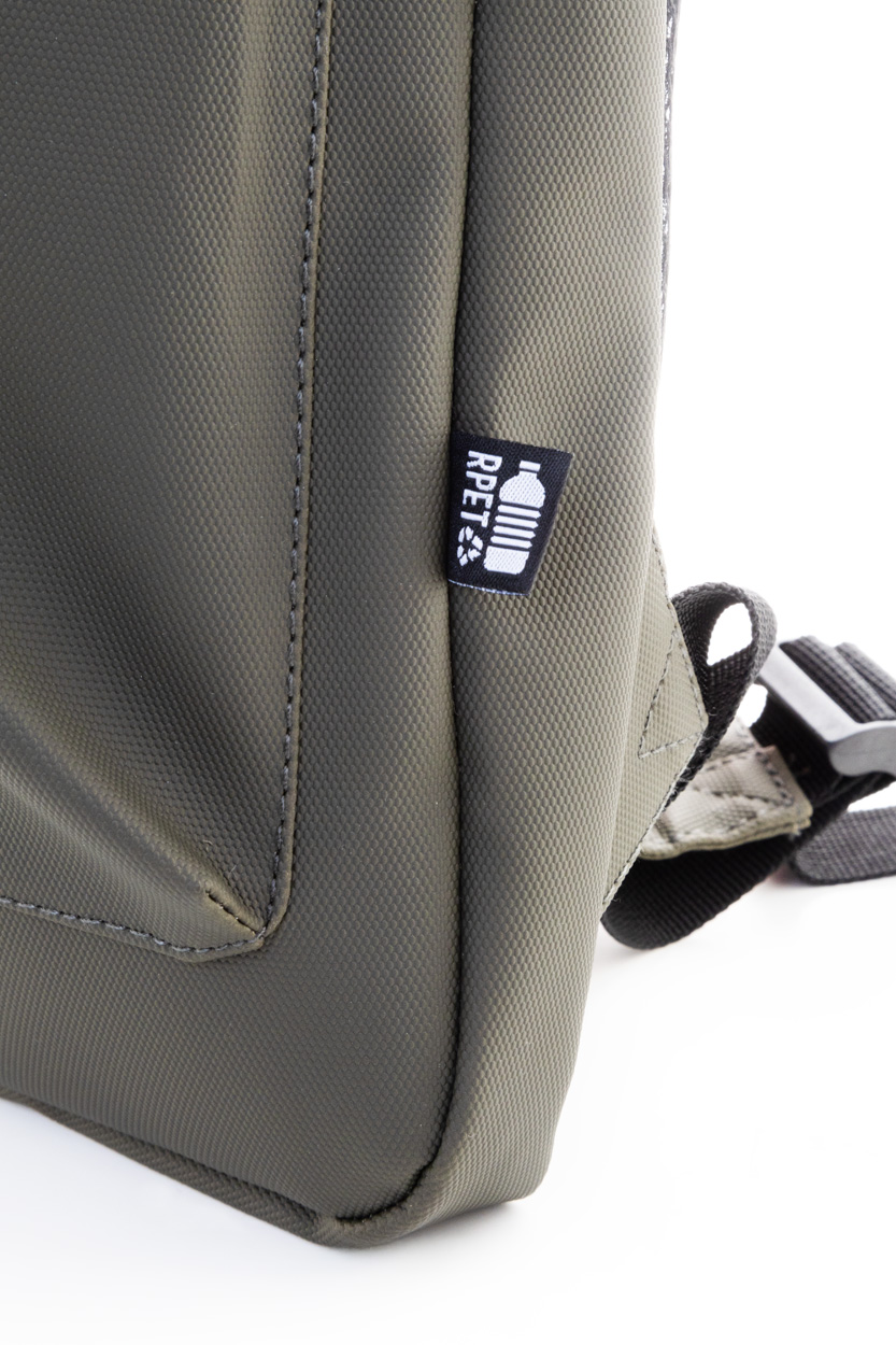 Wasserdichter, schlanker RPET-Laptop-Rucksack mit Reißverschlussfach für den Laptop (15") und Reißverschlusstasche vorne. Mit gepolstertem Rücken und Schultergurten. Material: PU-beschichtetes 600D RPET-Polyester. Mit RPET-Label.