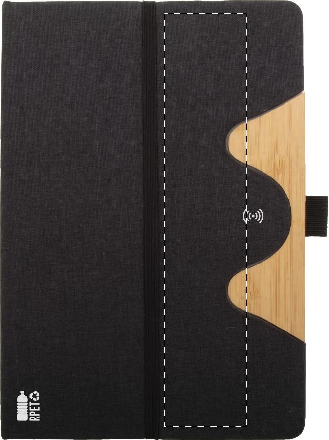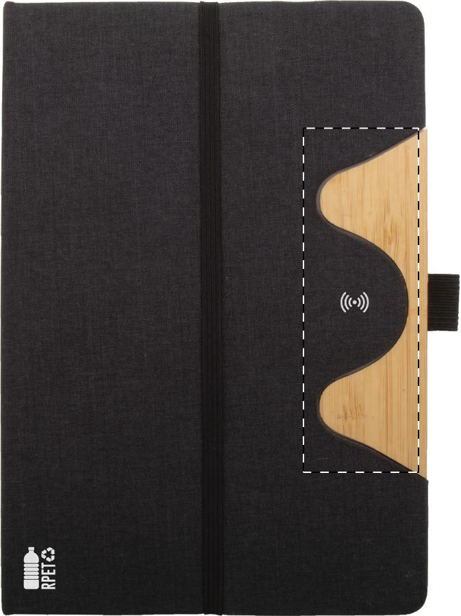 A5 Notizbuch mit Cover aus RPET Polyester mit Bambuseinsatz, Handyhalterfunktion, eingebautem Wireless-Fastcharger (15W) und 80 linierten Seiten aus RecyclingPapier. Inkl. USB-Ladekabel.Maße: 143×213×15 mmFormat: A5Papiertyp Notizbücher: Linierte SeitenInklusive USB Ladekabel: JaMaterial: Recyceltes PET Polyester, Bambus, Recycling PapierVeredelungsposition 1: Vorderseite - links (über dem Herzen)Technologie: SiebdruckMaximale Farben: 2Durchmesser: 0Druckcode: S2Veredelungsposition 2: Vorderseite - rechtsTechnologie: SiebdruckMaximale Farben: 2Durchmesser: 0Druckcode: S2Veredelungsposition 3: BambusteilTechnologie: GravurDurchmesser: 0Druckcode: E2Veredelungsposition 4: RückseiteTechnologie: SiebdruckMaximale Farben: 2Durchmesser: 0Druckcode: S2