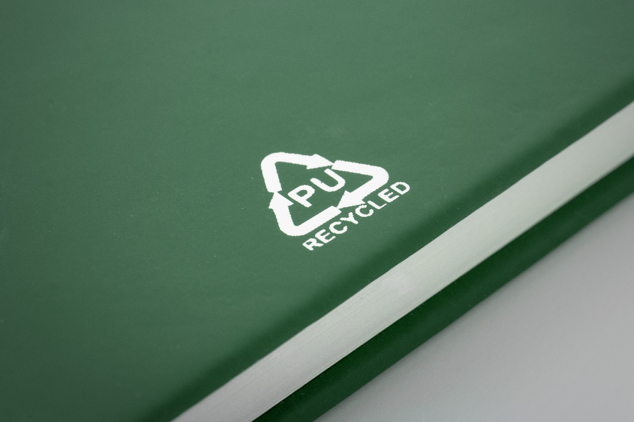 Notizbuch mit recyceltem PU-Lederbezug und 100 blanko Blättern aus Recyclingpapier. Mit farblich passendem Lesezeichen und Gummiband. A5-Größe.