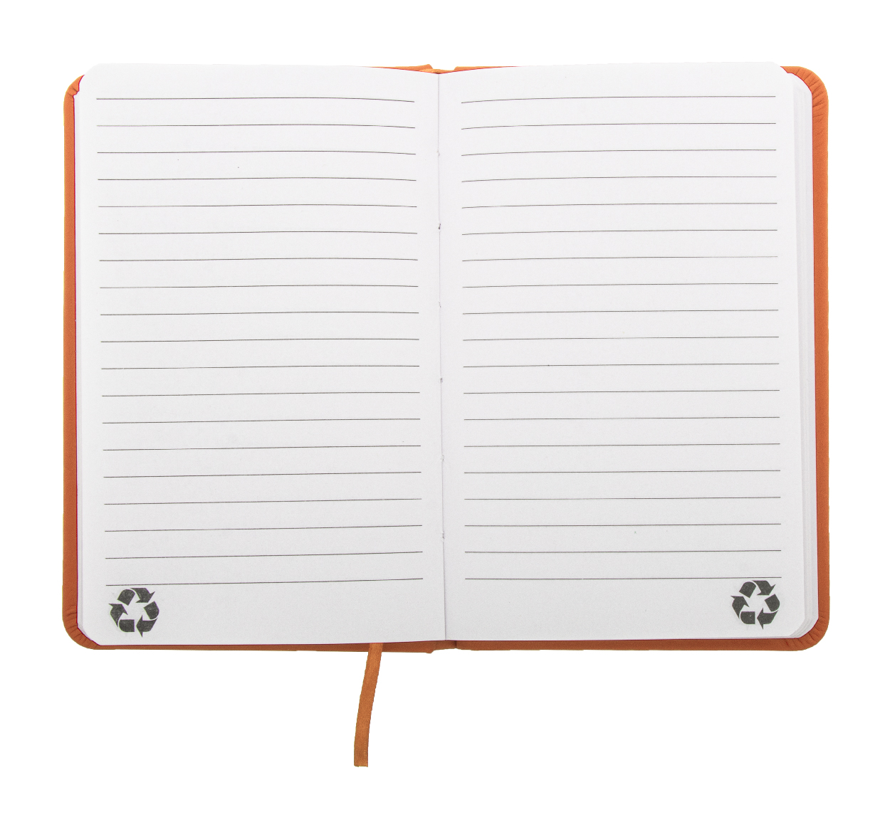 Notizbuch mit recyceltem PU-Lederbezug und 100 linierten Blättern aus Recyclingpapier. Mit farblich passendem Lesezeichen und Gummiband. A6-Größe.