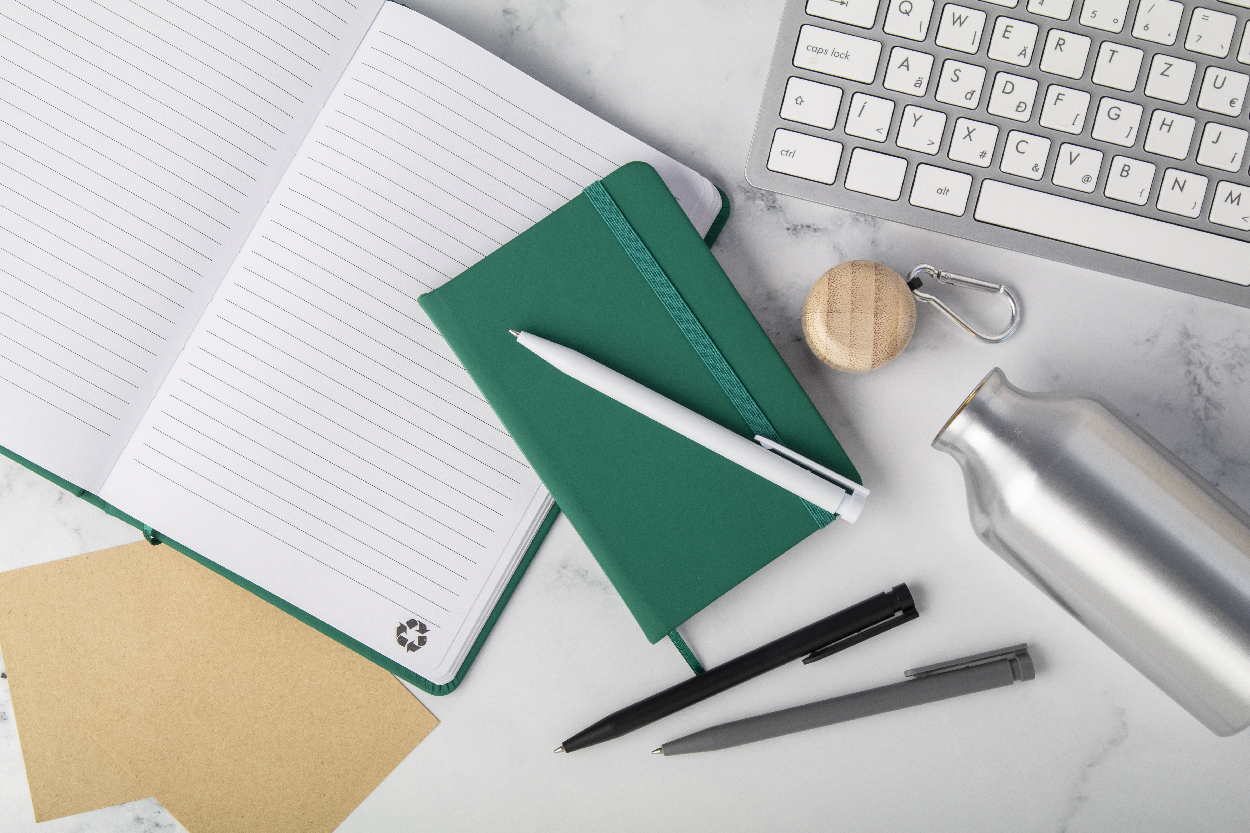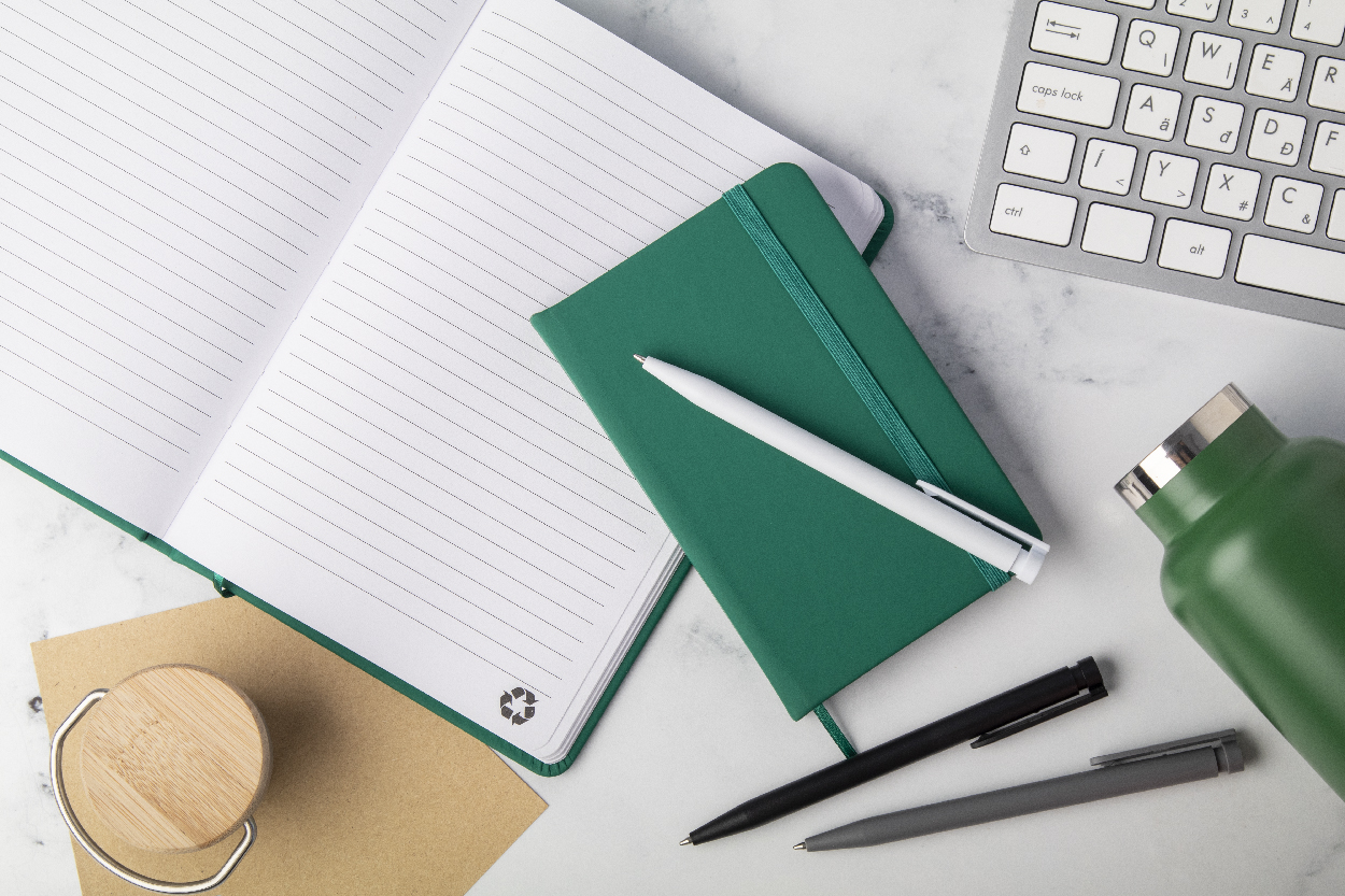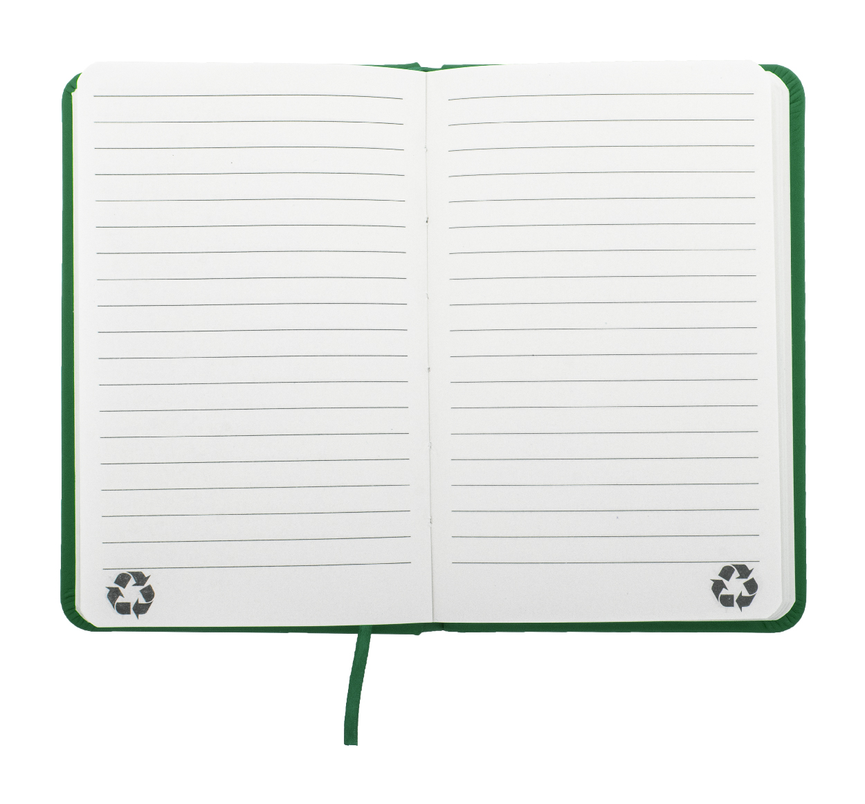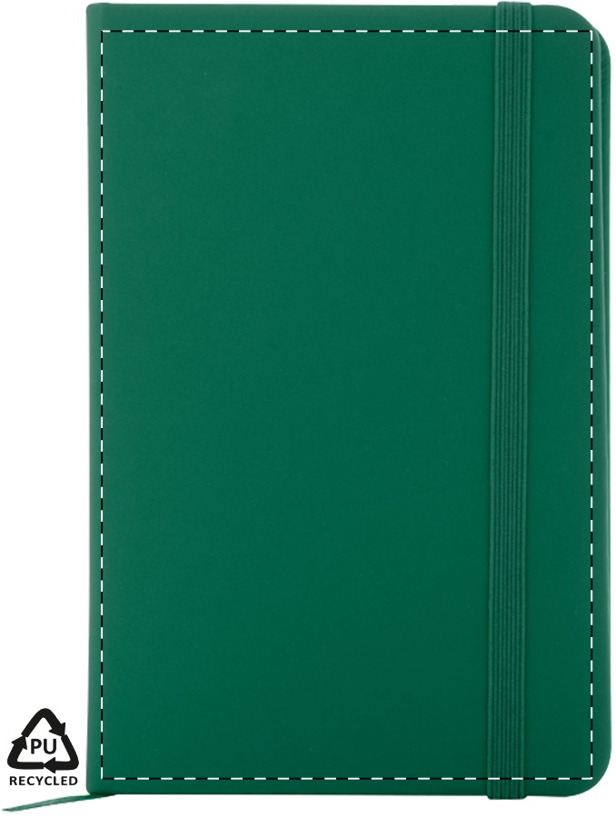 Notizbuch mit recyceltem PU-Lederbezug und 100 linierten Blättern aus Recyclingpapier. Mit farblich passendem Lesezeichen und Gummiband. A6-Größe.Maße: 95×145×15 mmFormat: A6Papiertyp Notizbücher: Linierte SeitenPapiergewicht: 70 g/m2Material: Recycelter PU-Lederbezug, Recycling Papier, GummiVeredelungsposition 1: VorderseiteTechnologie: UV-LED-Druck - EinzelnamenDurchmesser: 0Druckcode: NUVBTechnologie: TampondruckMaximale Farben: 4Durchmesser: 0Druckcode: P1Technologie: SiebdruckMaximale Farben: 2Durchmesser: 0Druckcode: S1Technologie: UV LED DruckDurchmesser: 0Druckcode: UVBVeredelungsposition 2: RückseiteTechnologie: UV-LED-Druck - EinzelnamenDurchmesser: 0Druckcode: NUVBTechnologie: TampondruckMaximale Farben: 4Durchmesser: 0Druckcode: P1Technologie: SiebdruckMaximale Farben: 2Durchmesser: 0Druckcode: S1Technologie: UV LED DruckDurchmesser: 0Druckcode: UVB