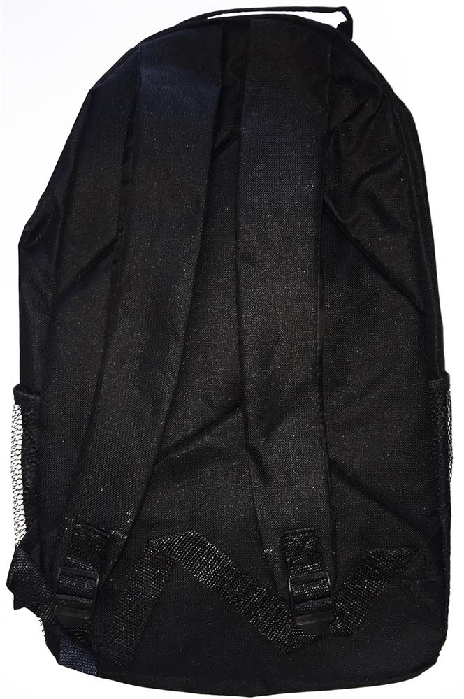 Schwarzer Rucksack mit farbigen Applikationen. Schnürung auf der Vorderseite. Netztaschen an den Seiten. 600D Polyester.